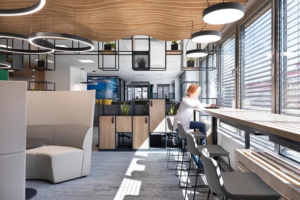 大型公共餐厅和休息区配有可随时演讲或汇报的先进设备。休闲咖吧形式的非正式会议室也是灵动办公形式中最受大家喜爱的场景。