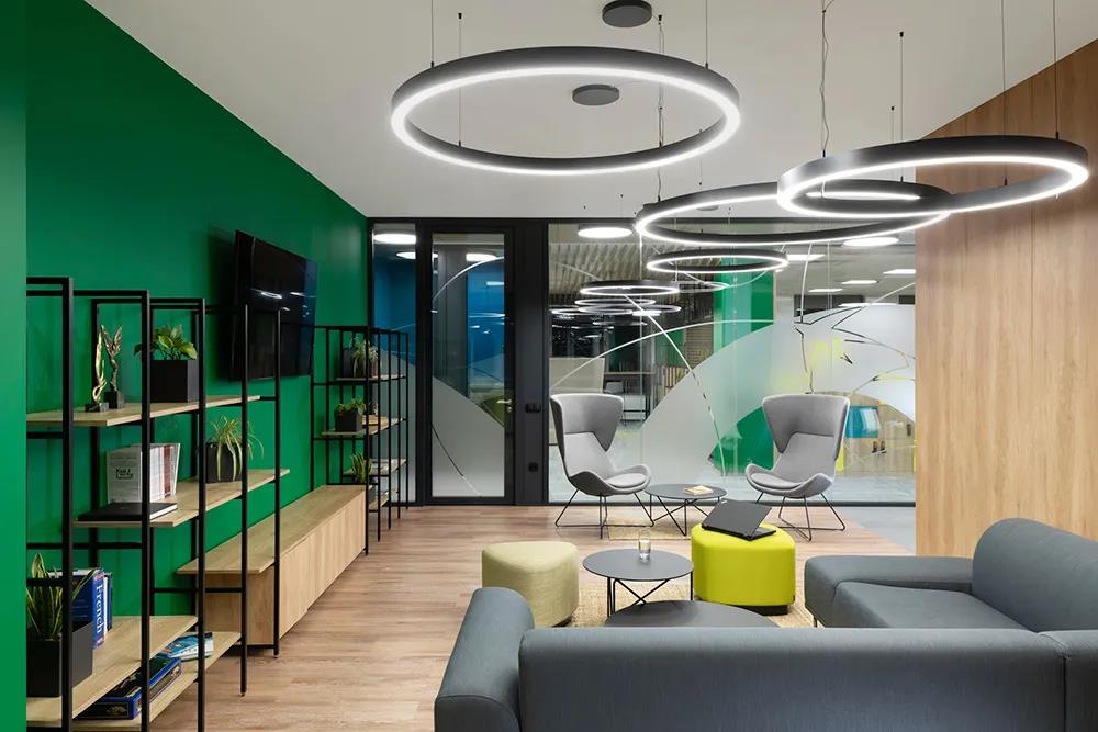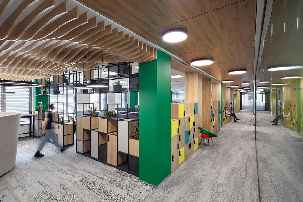 设计以公司特有的绿色为主色调,配以黄色和绿松石色,以及大量的绿植背景和温暖的木饰面。清新活力的色彩和动感的形式构建了一个颠覆传统企业形象、充满青春朝气的时尚办公空间。