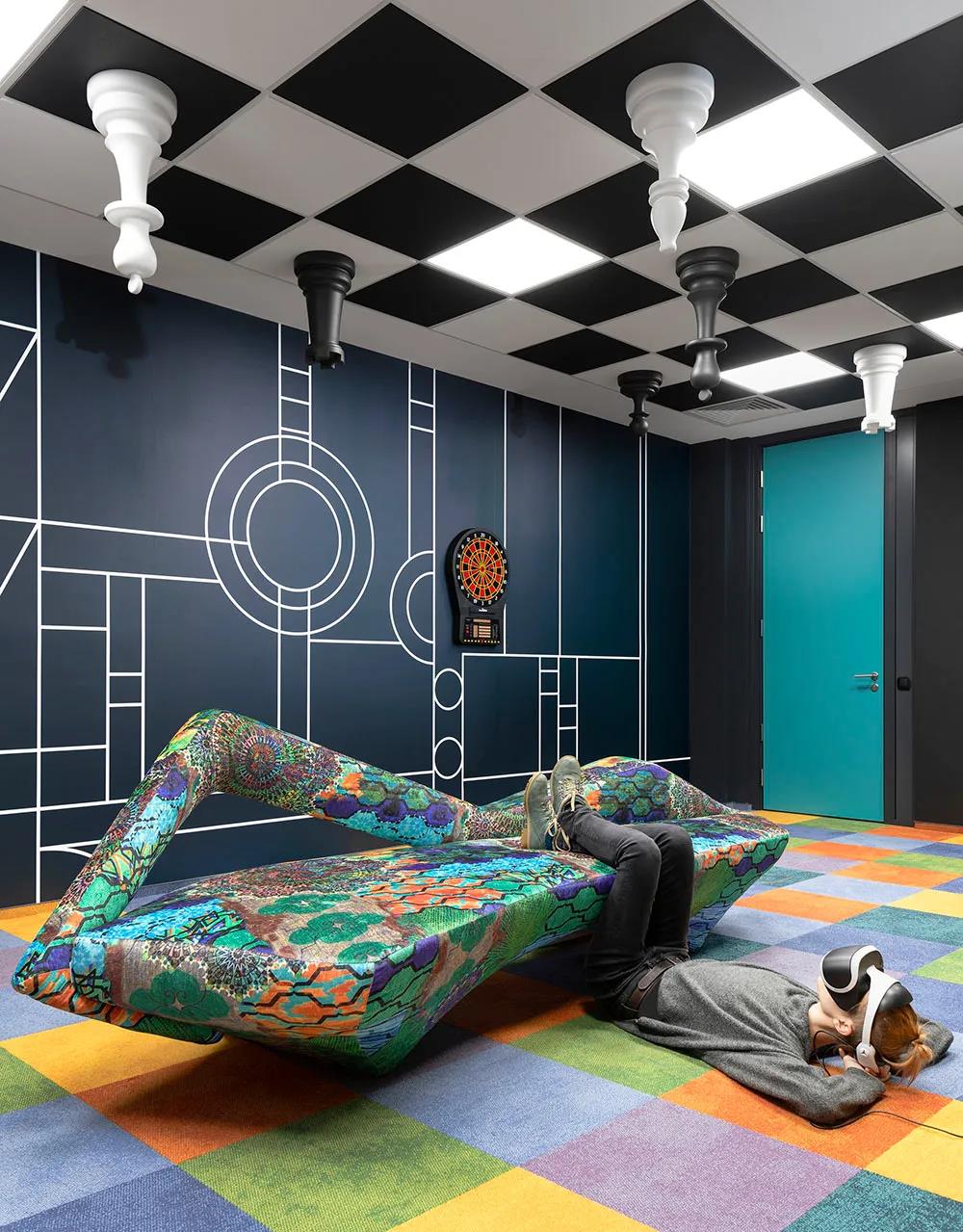 本案还规划有一间独具特色的游戏室,让员工可以暂时逃离工作的压力,在这里彻底放空大脑、重新蓄积能量、满血复活回到工作中。此外,设计还特别关注员工的身心健康和个人需求,专门为员工配备了提供身心康复的娱乐室。