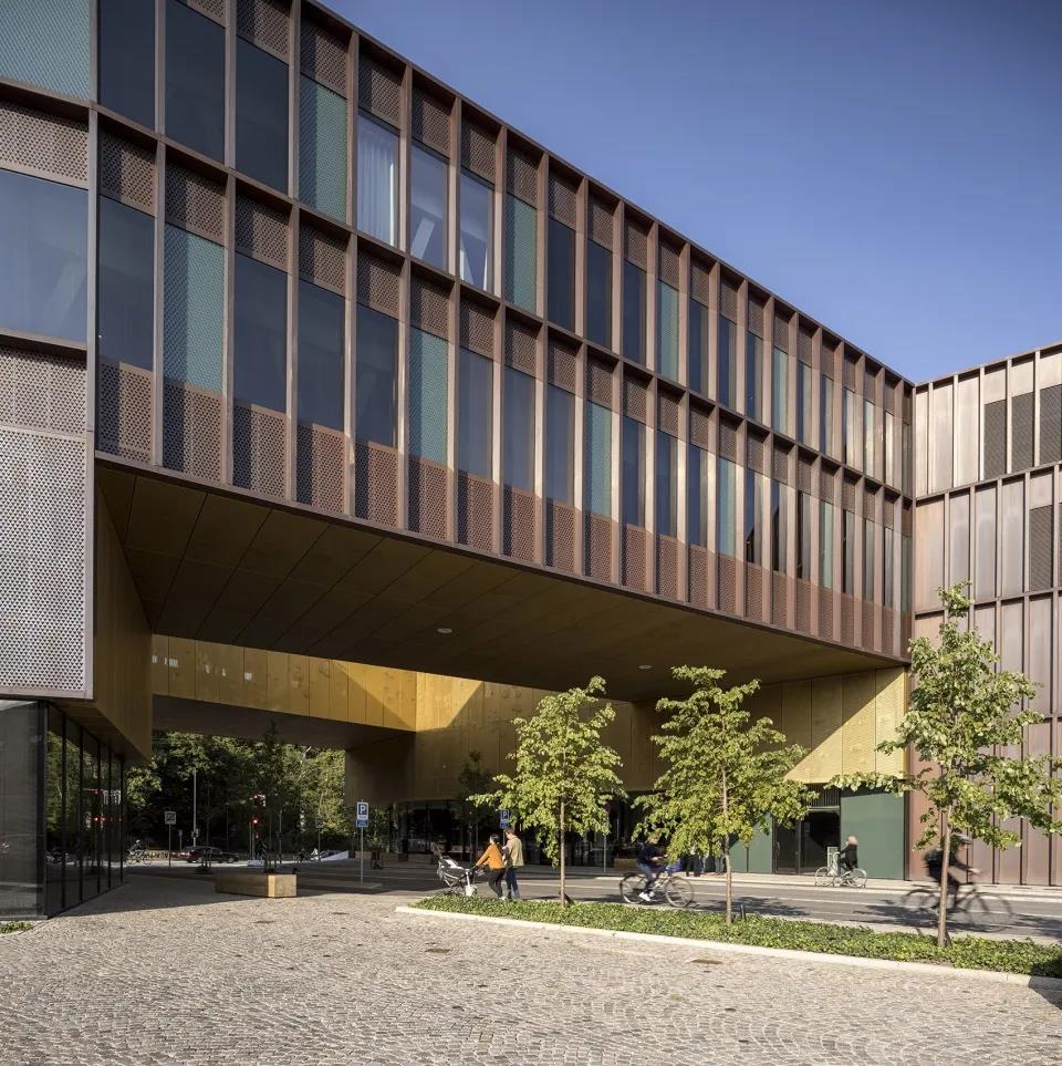 建筑立面由大型玻璃单元构成,并通过垂直的镀铜板条,得到富有韵律感的划分,铜质材料将人们的思绪引向旧时啤酒厂的储酒罐,细节上有很多有趣之处,待人们慢慢走近发现。