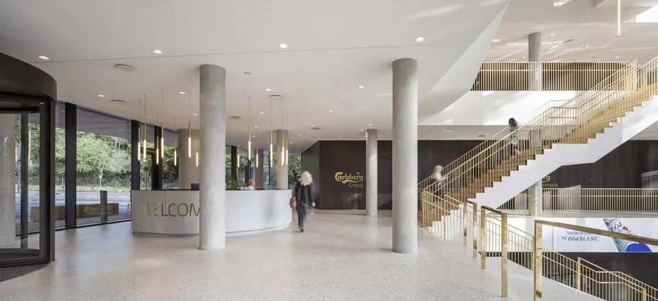 嘉士伯集团新中央办公室位于一座支持身份认同、知识共享与创新且同时与周围环境和谐相处的建筑当中,其设计为现代而又充满活力的工作环境提供了框架。