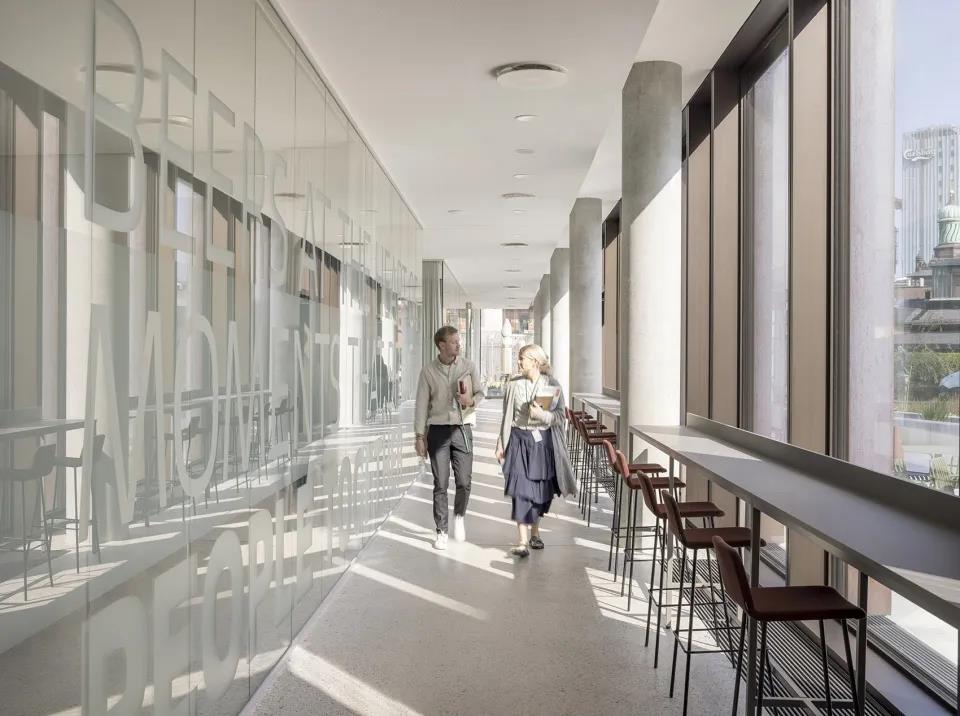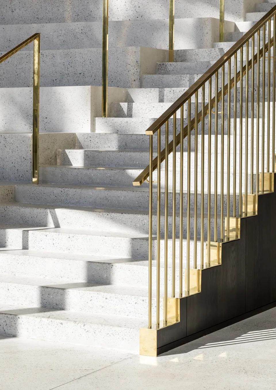 亲切友好的空间,向来访者和路人传达出开放的空间感,带来朝向花园和建筑的双向视野,宽阔的楼梯结合了带软垫的座位平台,可供人们坐下来休息,或是进行其他工作性质的交流。
