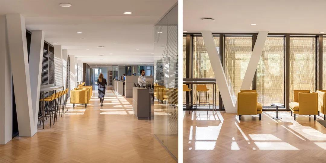 建筑的中庭向花园打开,采光太棒了,中庭空间连接了建筑中的所有楼层,其周围分布着公共区域,将所有的办公区域从水平和垂直方向,统一为一体化的工作社区。