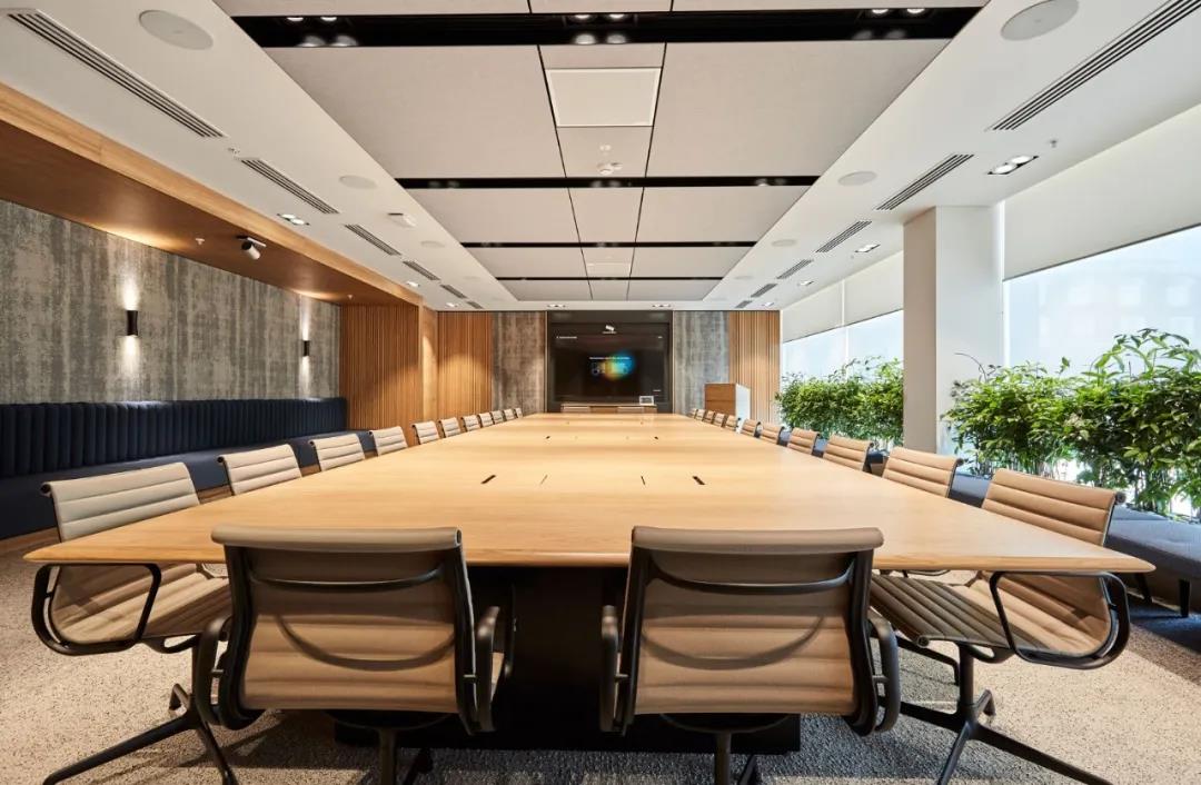 原木空间,绿色环保办公室装修设计案例分析:随处可见的浅色原木办公家具,令办公空间轻松自然,全木条搭建会议室别具一格。这样的办公室装修设计让员工能够享受办公空间带来的愉悦感,提高工作效率。