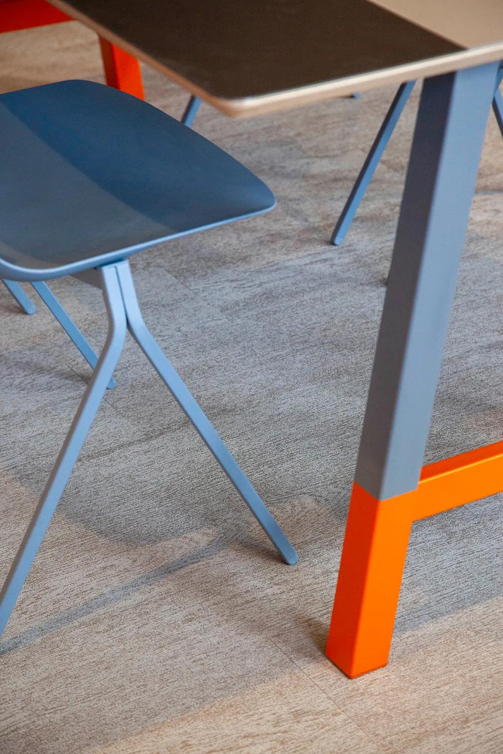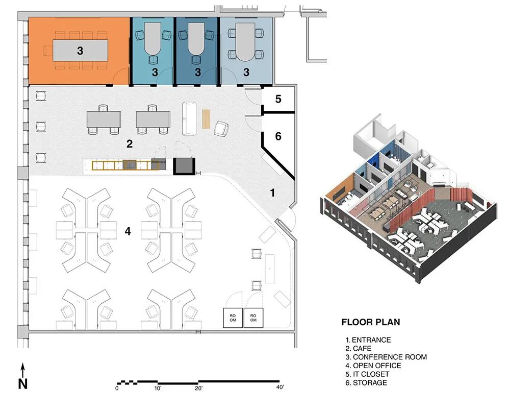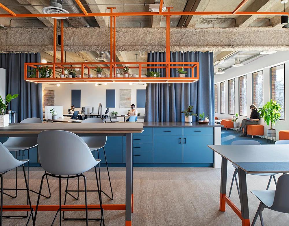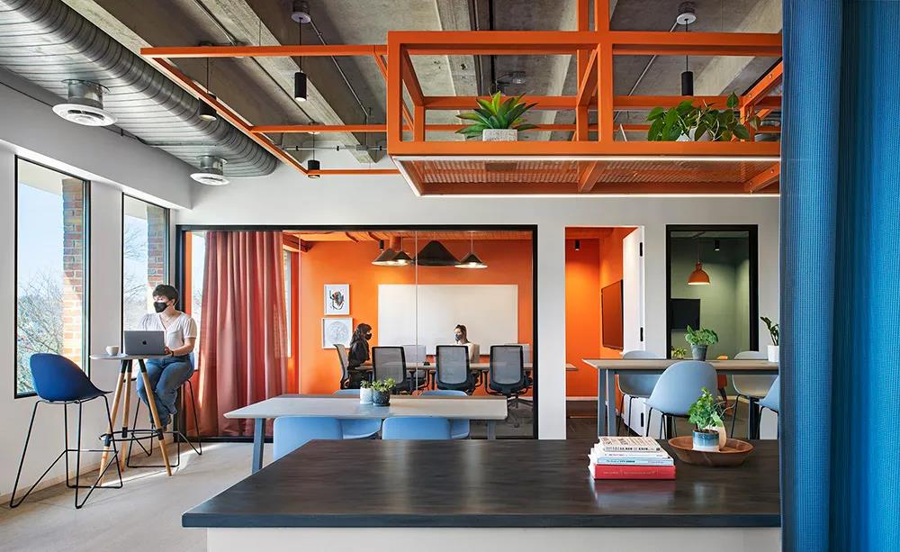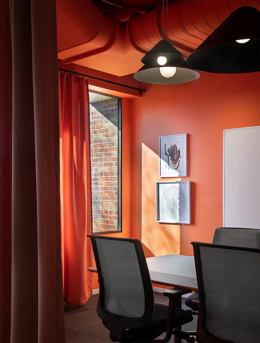 每间会议室都以一种色彩来创建一种沉浸式的色彩体验,其灵感源自该公司的瑞典起源,他们将色彩作为文化实践照亮该地区漫长的冬夜。这些明亮的色彩还以金属网格的形式呈现于裸露的顶部结构下,缓和混凝土楼板粗糙坚硬的质感。灰色和蓝色是从属品牌色,应用于小型会议室以营造宁静的氛围;作为主品牌色的橙色则用于带有大型外窗的正式会议室。