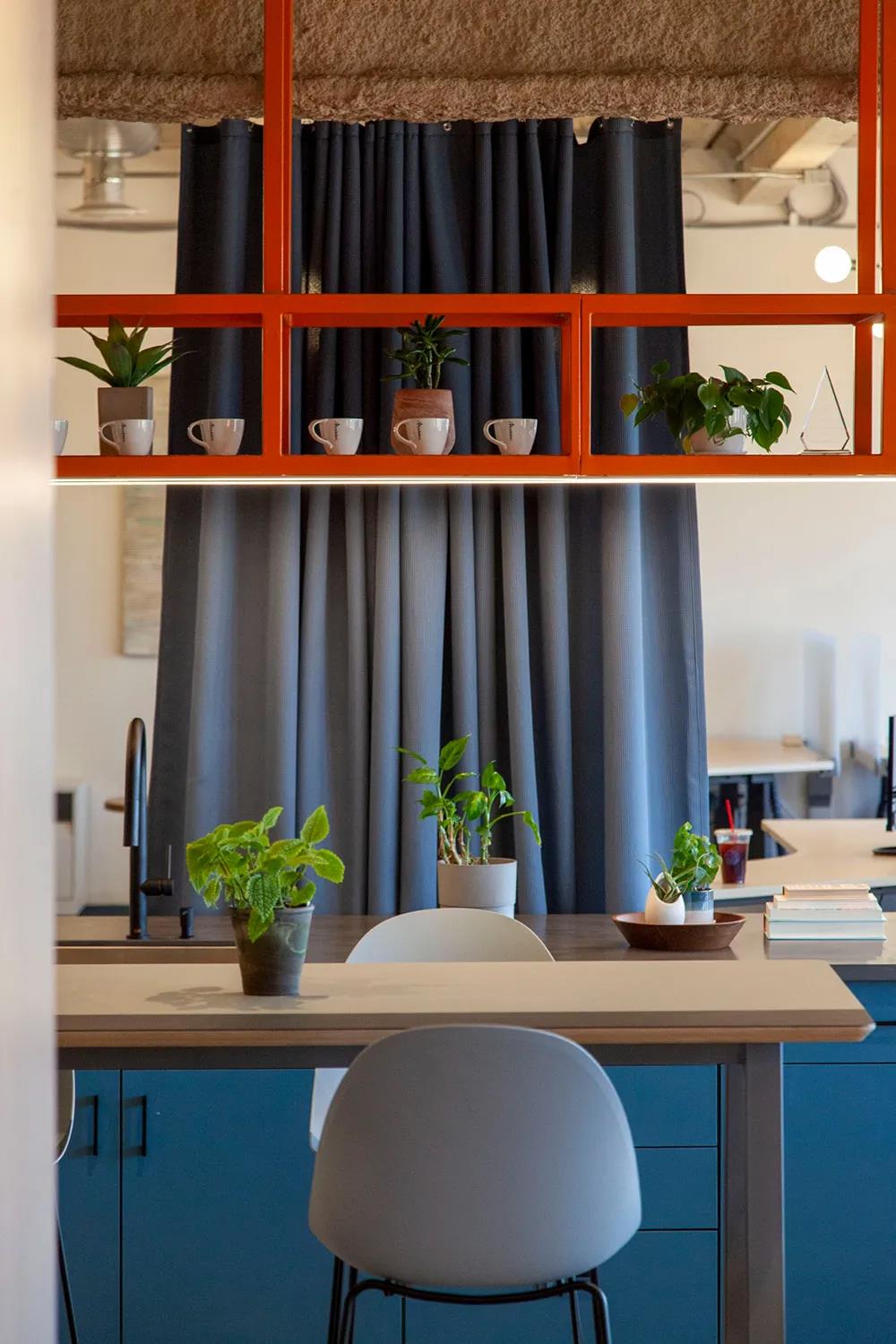 作为一个只有316平方米的小空间,更加注重合理的平面规划和灵活应用,避免出现局促的空间感。设计师在开放空间和会议室中采用了窗帘的形式来建立灵活的视线连接和隐私需求,同时具有界定空间和降低噪音的功能。窗帘的方式能够灵活塑造空间区域,而无需建筑施工成本,创建了一个最经济的灵活空间配置方式。