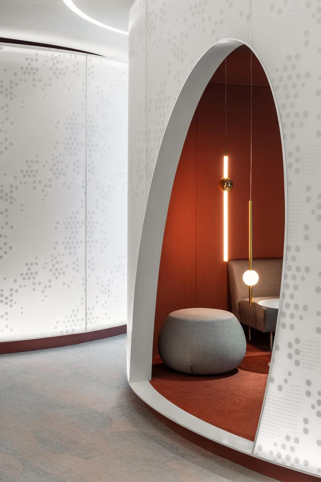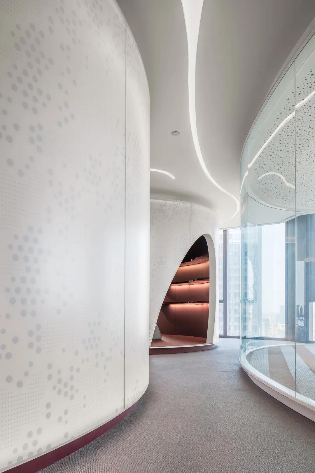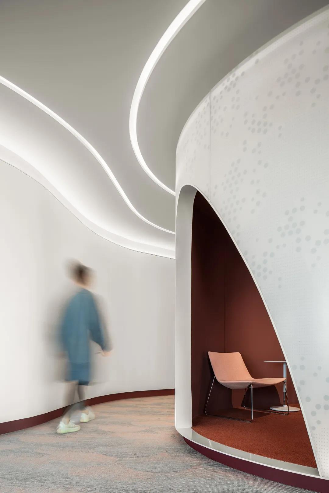 建筑空间是静态的,但是用户的视觉和情感体验因场景而异。接待区给人以第一印象,曲线产生一种未来感。充满活力的曲线象征着创造性思维的无限性,使空间更富趣味并丰富了空间情绪的表达。