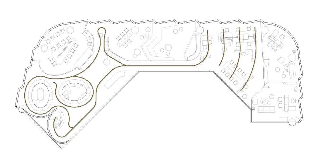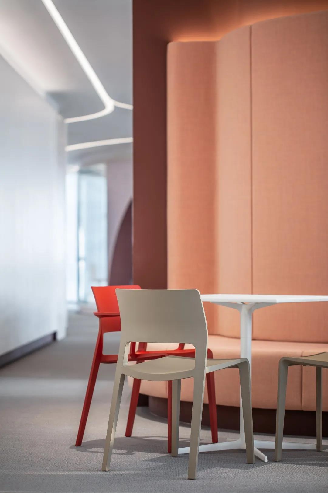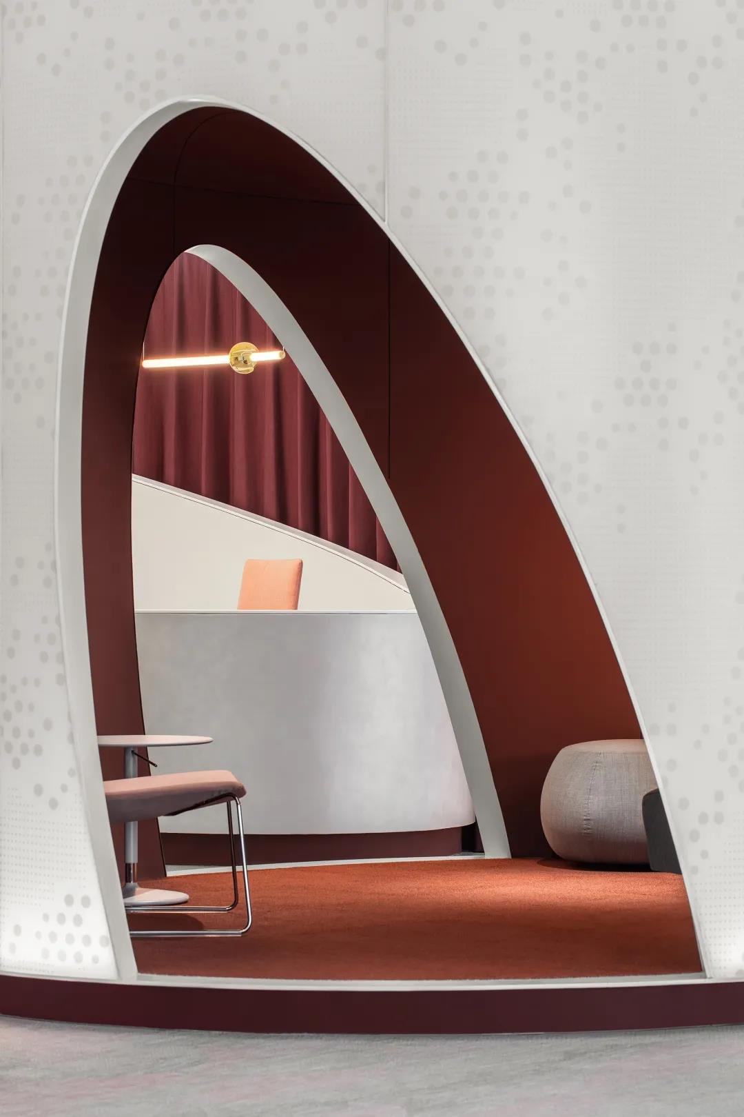 建筑空间是静态的,但是用户的视觉和情感体验因场景而异。接待区给人以第一印象,曲线产生一种未来感。充满活力的曲线象征着创造性思维的无限性,使空间更富趣味并丰富了空间情绪的表达。