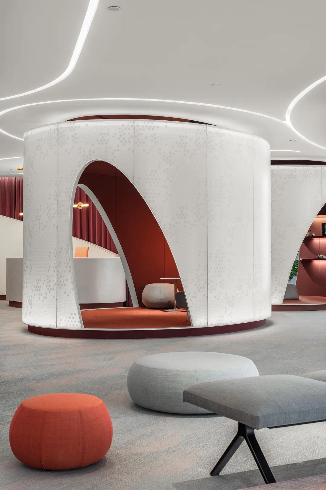 在接待大厅内,有两个醒目的圆柱形结构,分别用作等候区和阅读区。这些卷具有白色的外观和红色的内部饰面,具有未来派和时尚的形式。设计师希望在人们进入办公室区域之前,在这两个半封闭的宁静空间中使人们平静下来。