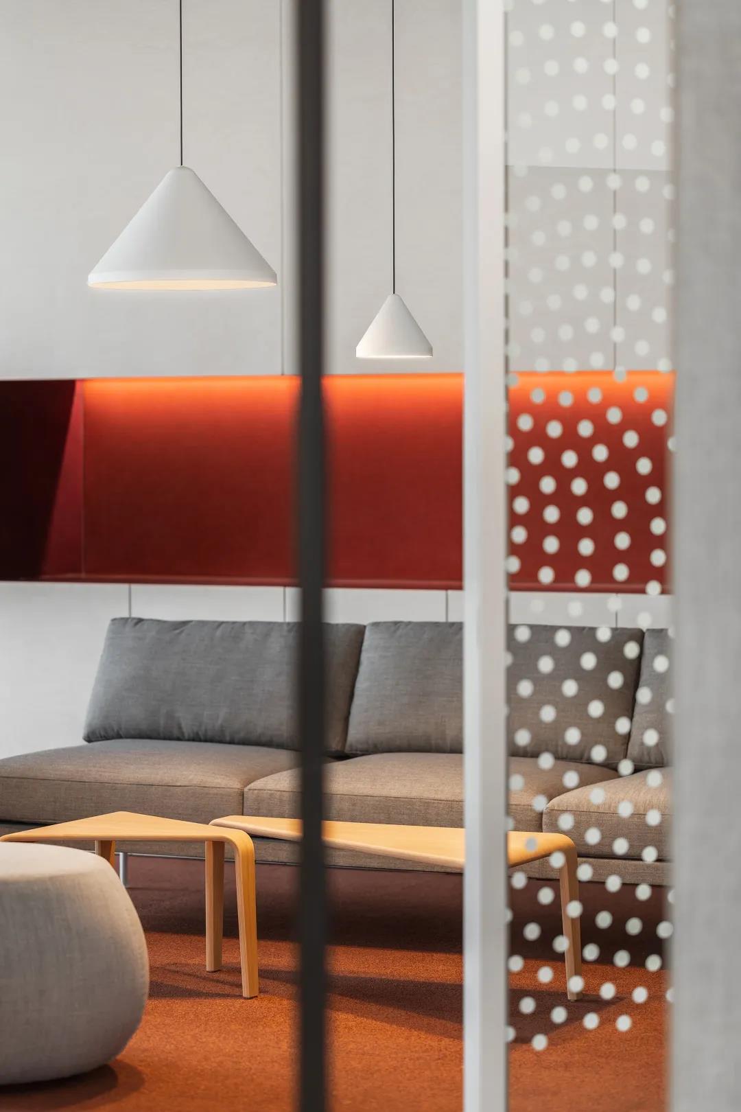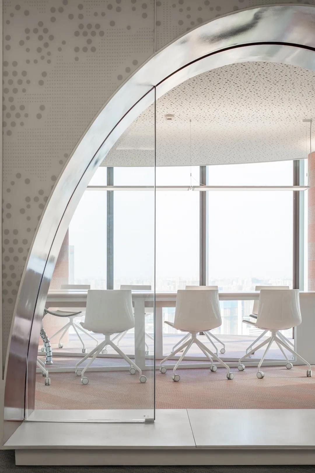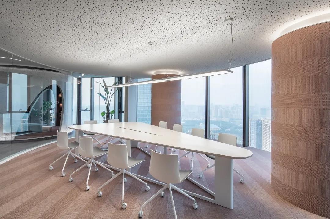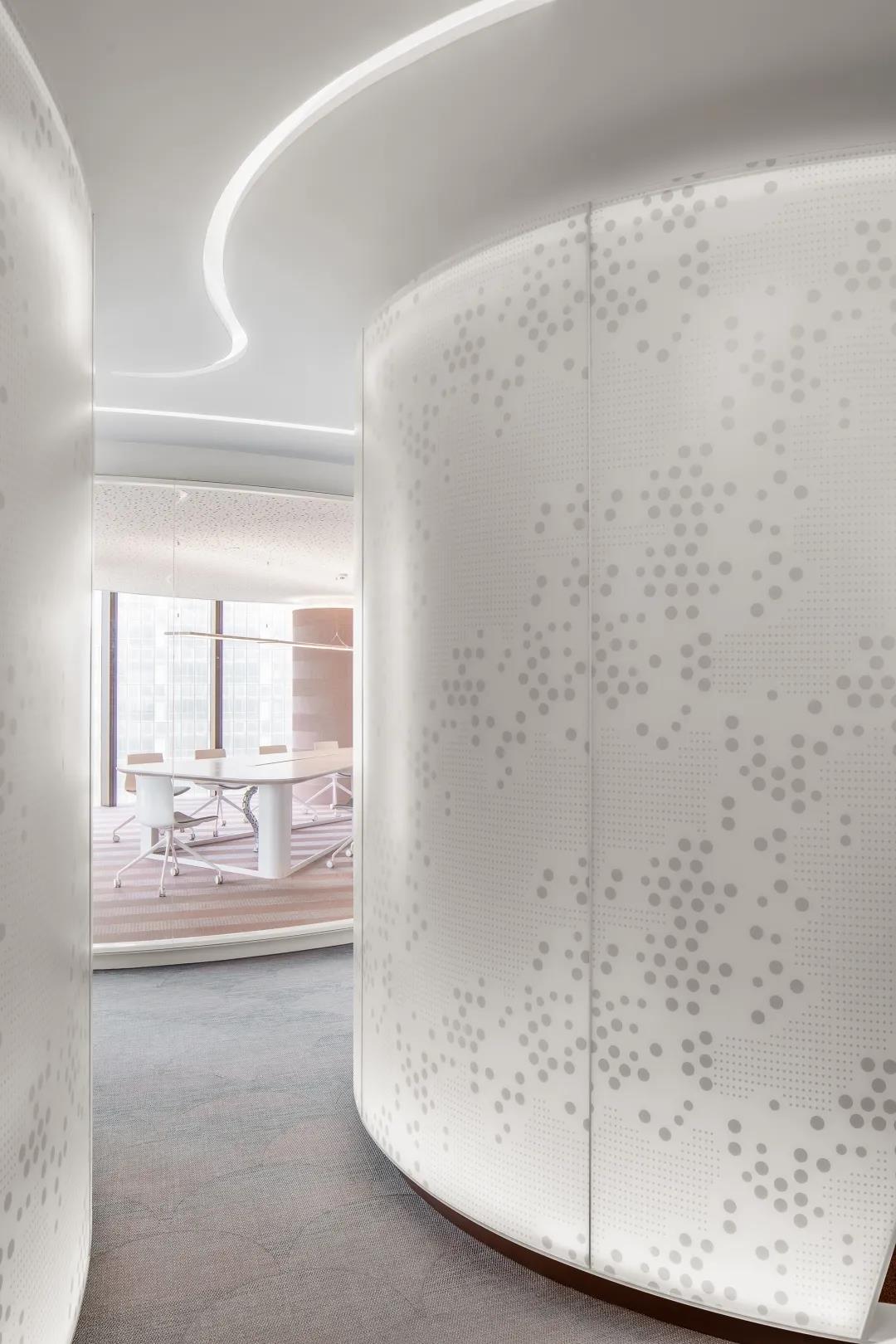 办公室和会议室的天花板采用白色穿孔铝板,可营造出灵活的空间氛围,并与灯光一起产生柔和轻巧的视觉效果。