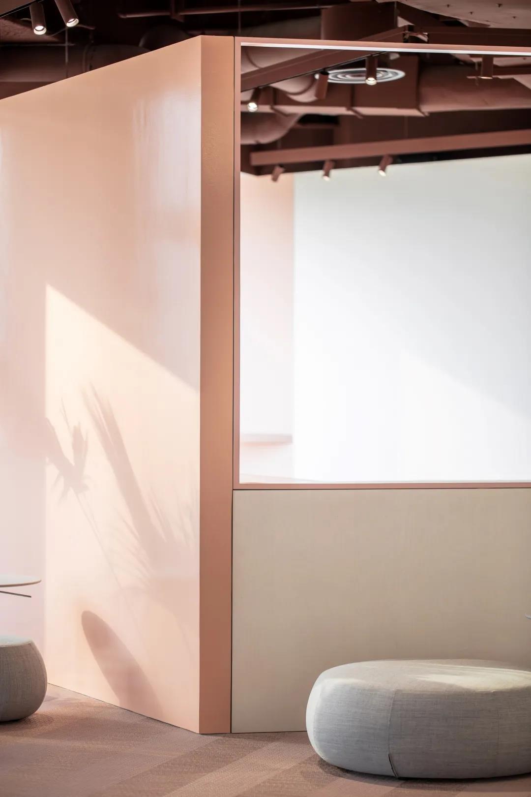 与传统公司不同,客户是一家电子商务公司,该公司需要更大的灵活性,且固定工作站很少。考虑到这一点,设计团队没有采用传统的间隔,而是创建了几个独立的功能区域,将它们组合在一起可以构成一个较大的整体聚集空间。同时,该团队根据勒·柯布西耶的色彩理论,利用红色,白色和粉红色色调形成了多层工作区。