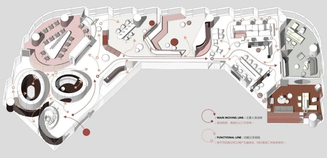 调色板在设计中起着重要作用,作为指示不同区域过渡的线索。白色是突出的基调,在不同场景中占据着主导地位。动态的红色调使空间充满活力,并创造出戏剧性的视觉效果;其余的色调(例如粉红色)用于协调环境。不同颜色的组合有助于塑造整体空间形式。