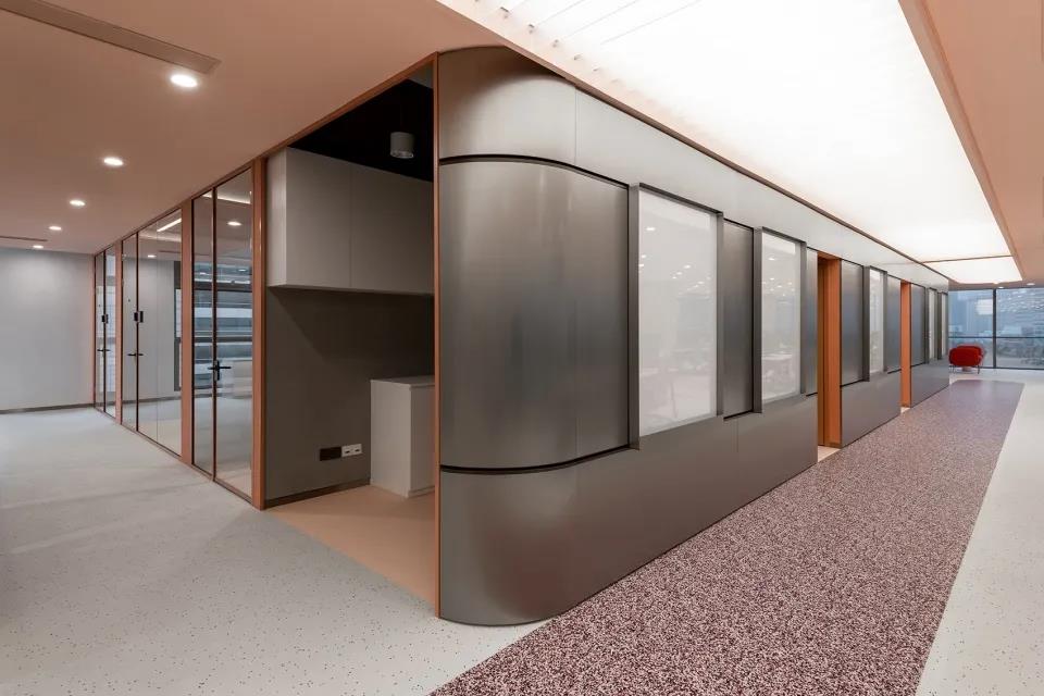 空间四周排布着会议室、打印室、茶水间和一些安静角落,由珊瑚色金属屏风做围合,其天花也延续了屏风元素,和暴露的混凝土天花形成对比。
