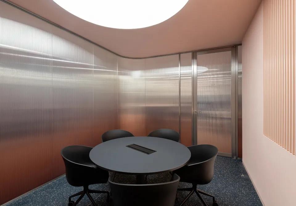 进门处和前台旁的三间会客室,使用渐变色长虹玻璃,颜色由粉色向透明过渡,会议室内墙壁呈淡粉,嵌有不对称装饰面板,天花采用椭圆形透光膜照明。