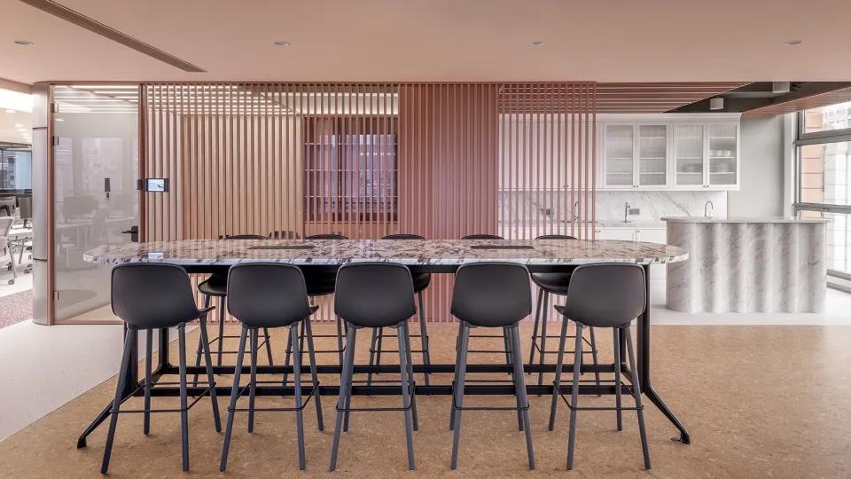 茶水间内有一个由卡拉白大理石打造的波浪形岛台,休息室的地板为软木,一张纹理感强烈的定制大理石长桌,让这里看起来休闲感十足。