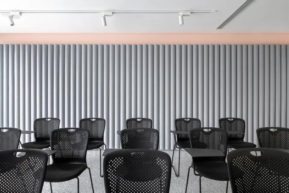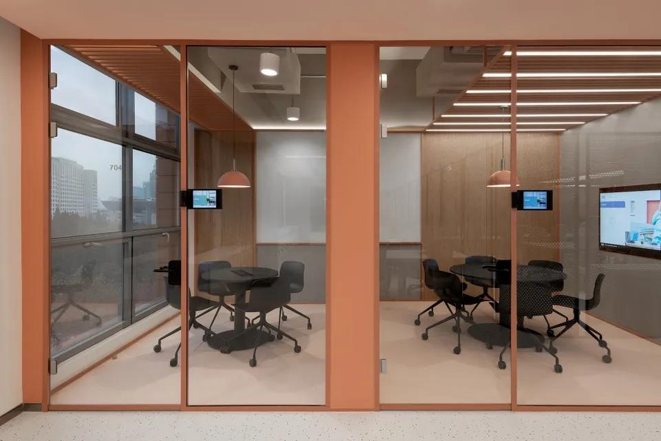 天花为长条形张拉膜光幕,外饰一层玻璃格栅,与之相对的是深红色的椭圆形乙烯基地面装饰。拉丝不锈钢墙板外部嵌有滑动式白板和留言板,便于办公过程中的协同合作。