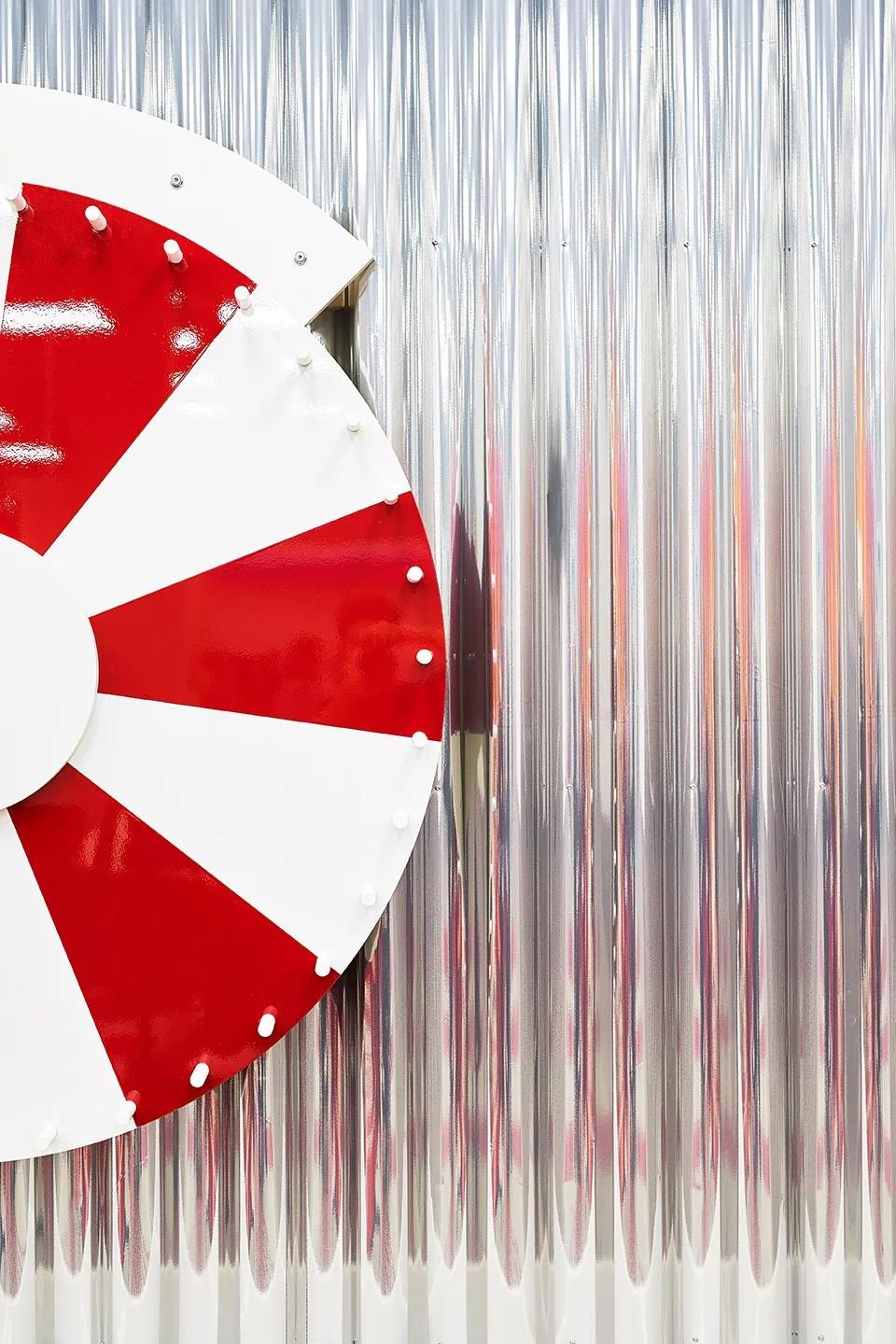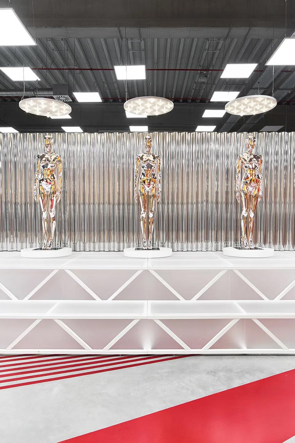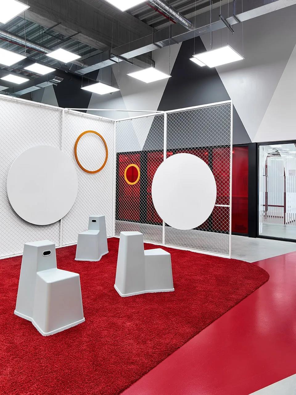 纯白色搭配热情的红与橙,宽阔蜿蜒的错层式台阶背后是闪闪发光的波纹金属墙壁,地面上铺满了辐射状的红色图案,潜台词是:让我看到你的活力。