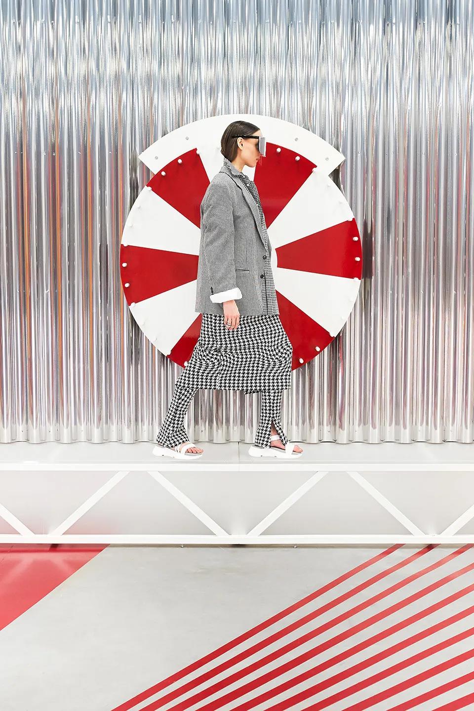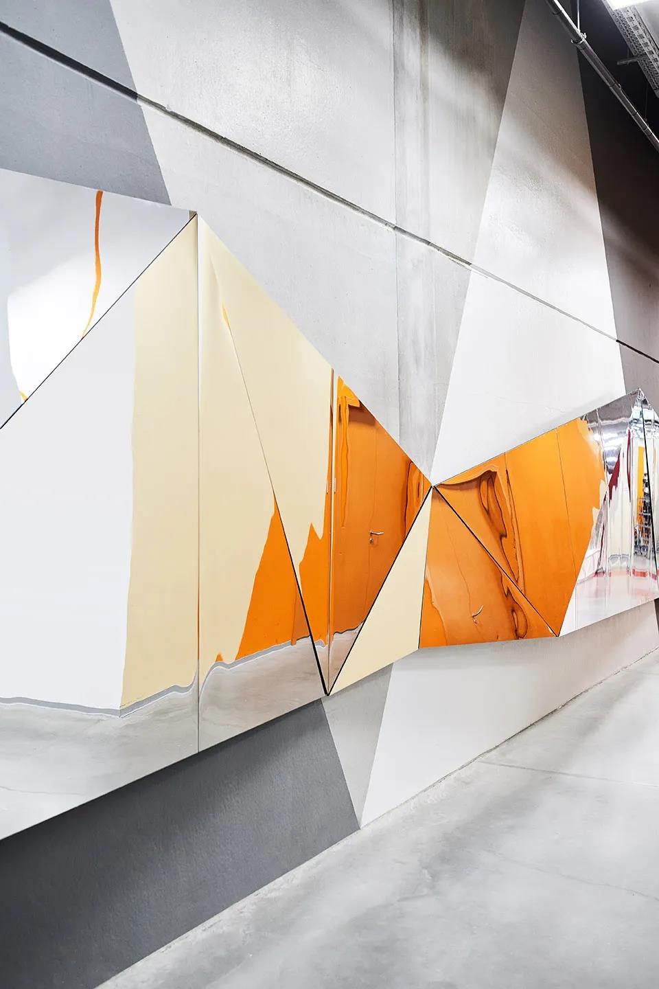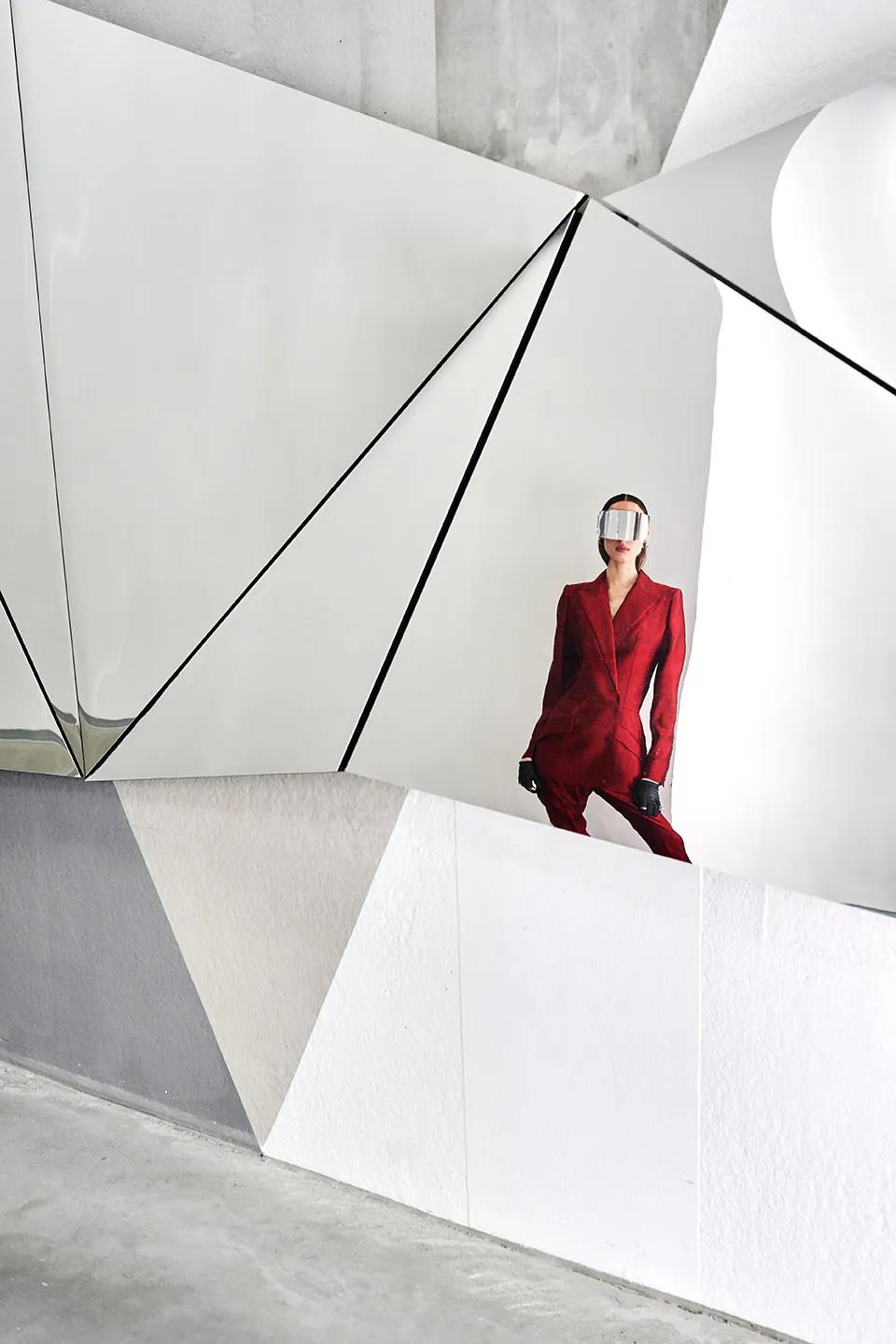 纯白色搭配热情的红与橙,宽阔蜿蜒的错层式台阶背后是闪闪发光的波纹金属墙壁,地面上铺满了辐射状的红色图案,潜台词是:让我看到你的活力。