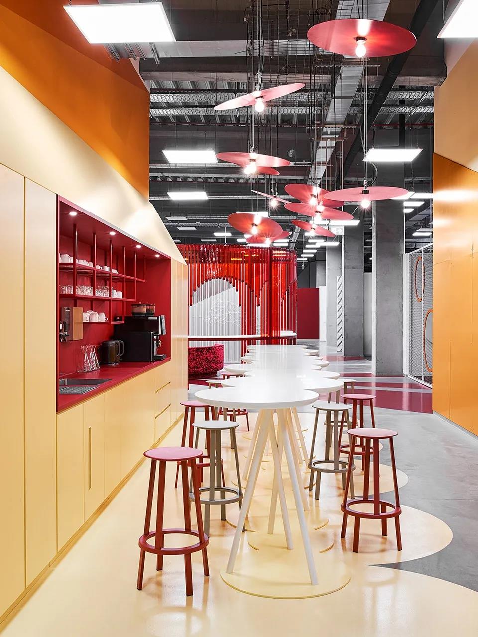 这种“一闪而过”的工作方式反映在工作场所的各个区域。中央小厨房的灯具看上去就像是马戏团杂耍表演中使用的碟子,呼应着下方蜿蜒前行的长桌。