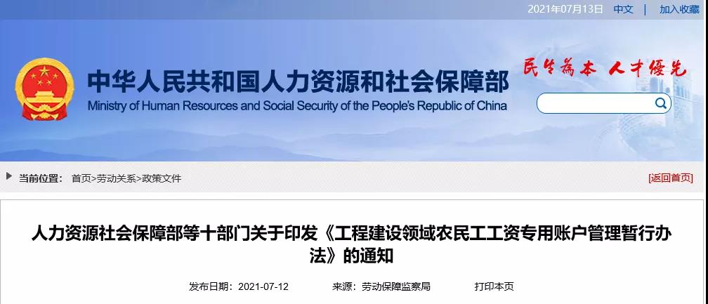 近日,人社部、发改委、财政部、住建部等10个部门联合印发《工程建设领域农民工工资专用账户管理暂行办法》。本暂行办法自印发之日起施行。办法施行前已开立的专用账户,可继续保留使用。