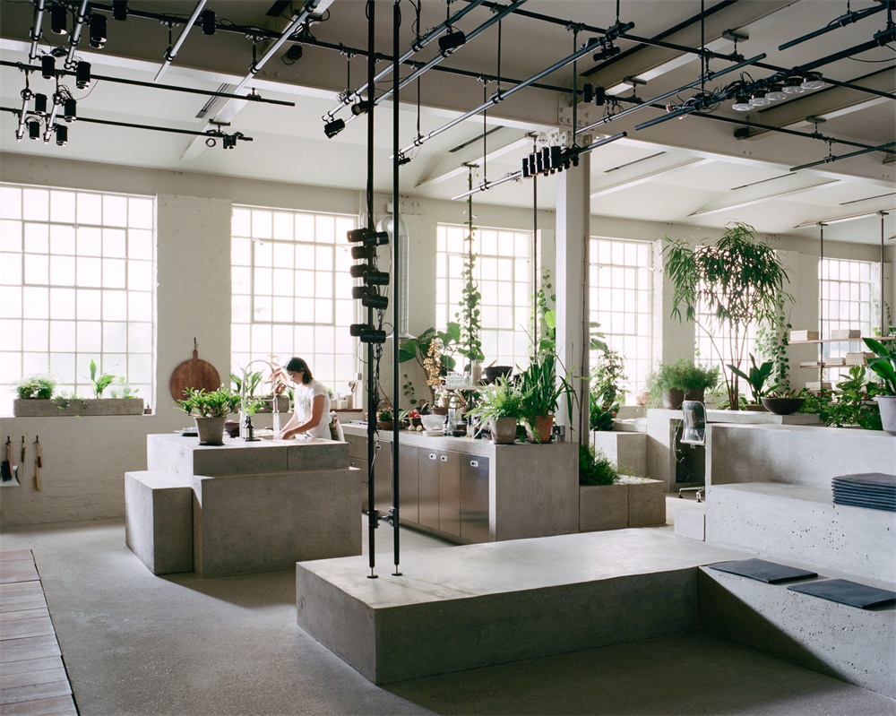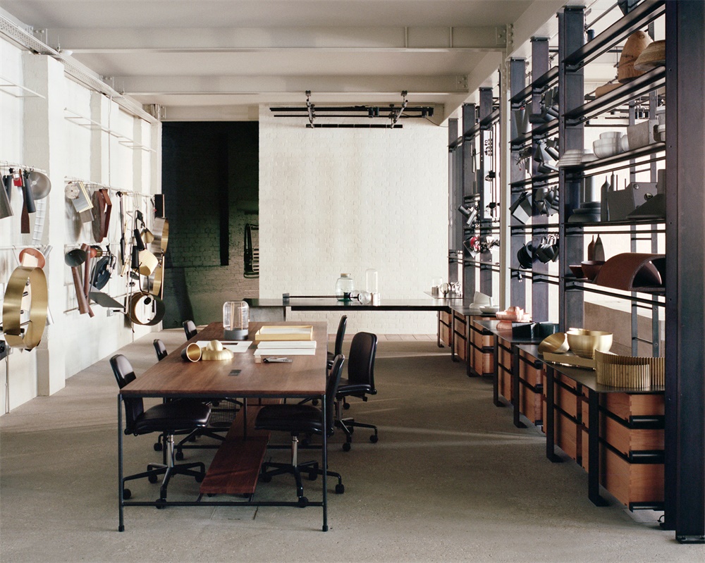 一个网格钢框架,展示样品材料,模型和照明原型已经建立在房间的一边,作为一个“脊柱”之间的主要办公楼层和工作室空间。