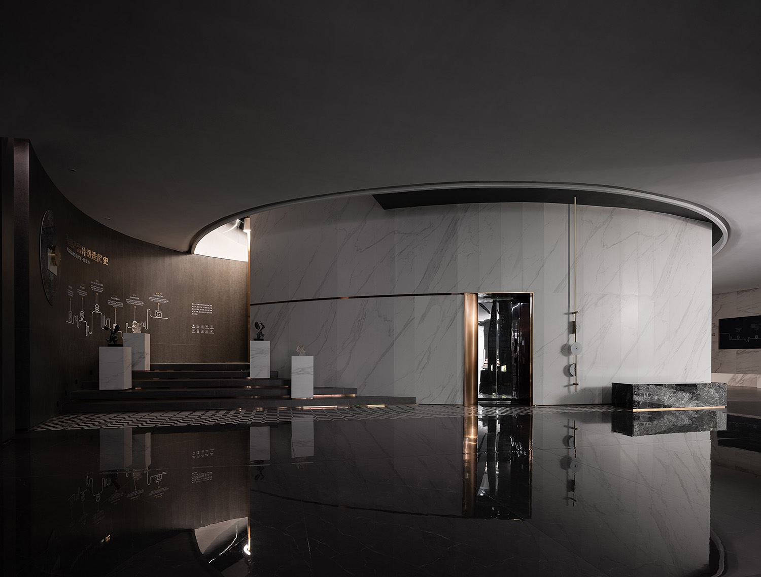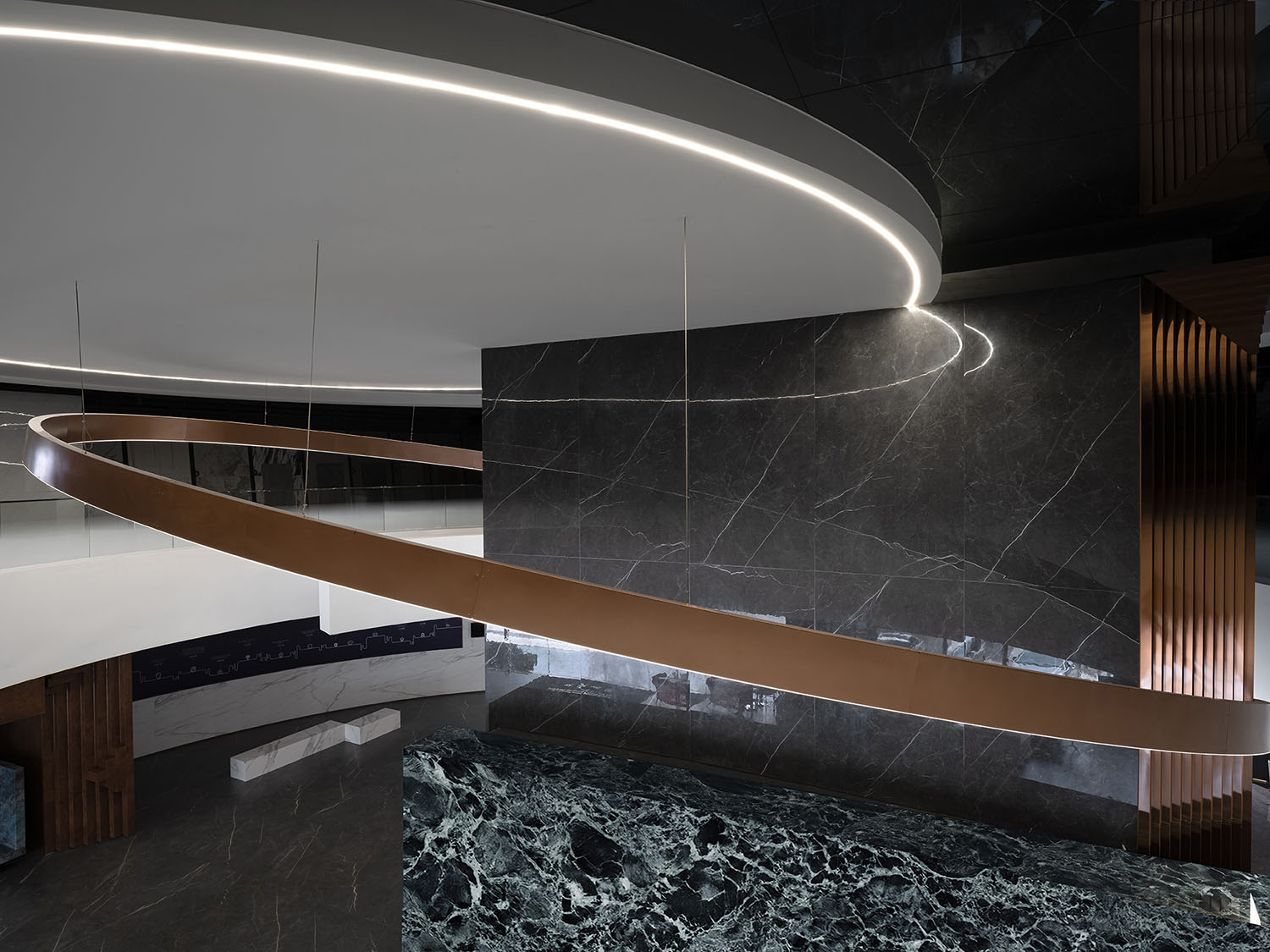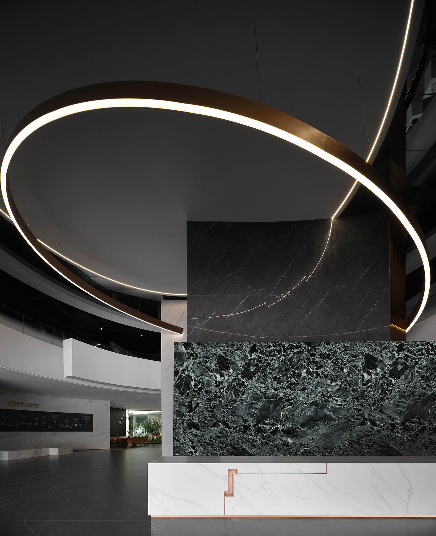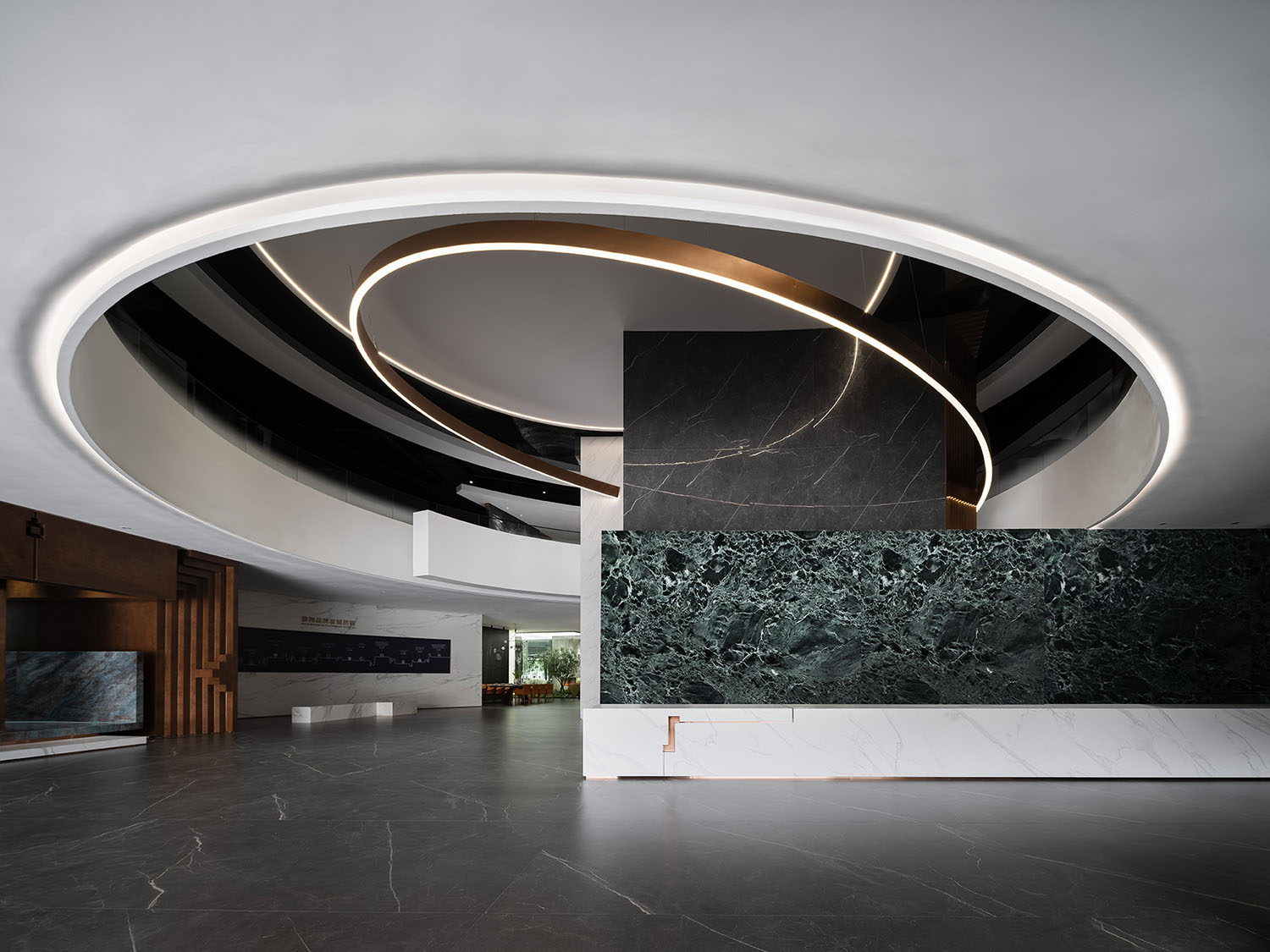 大厅中的圆形、中空结构创造了一种几何美学,蕴含着东方的“圆天方土”哲学,同时也展现了星星的轨迹。在视觉效果和力学原理相结合的基础上,圆形线条设法创造了耐人寻味和意想不到的空间体验。