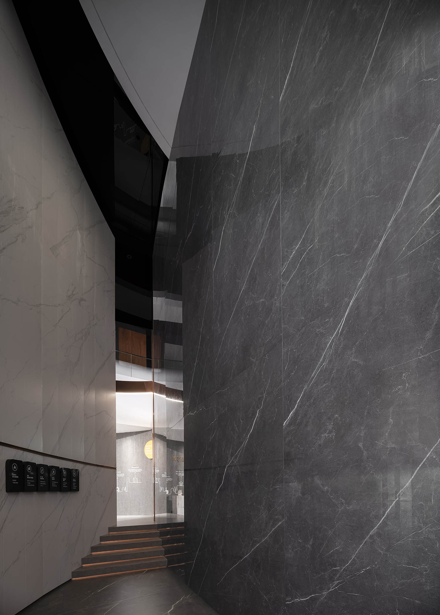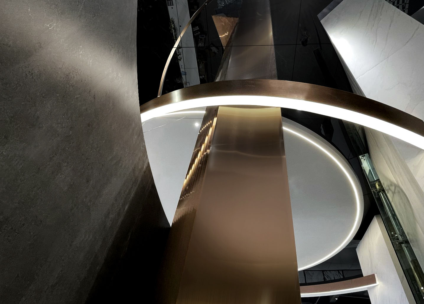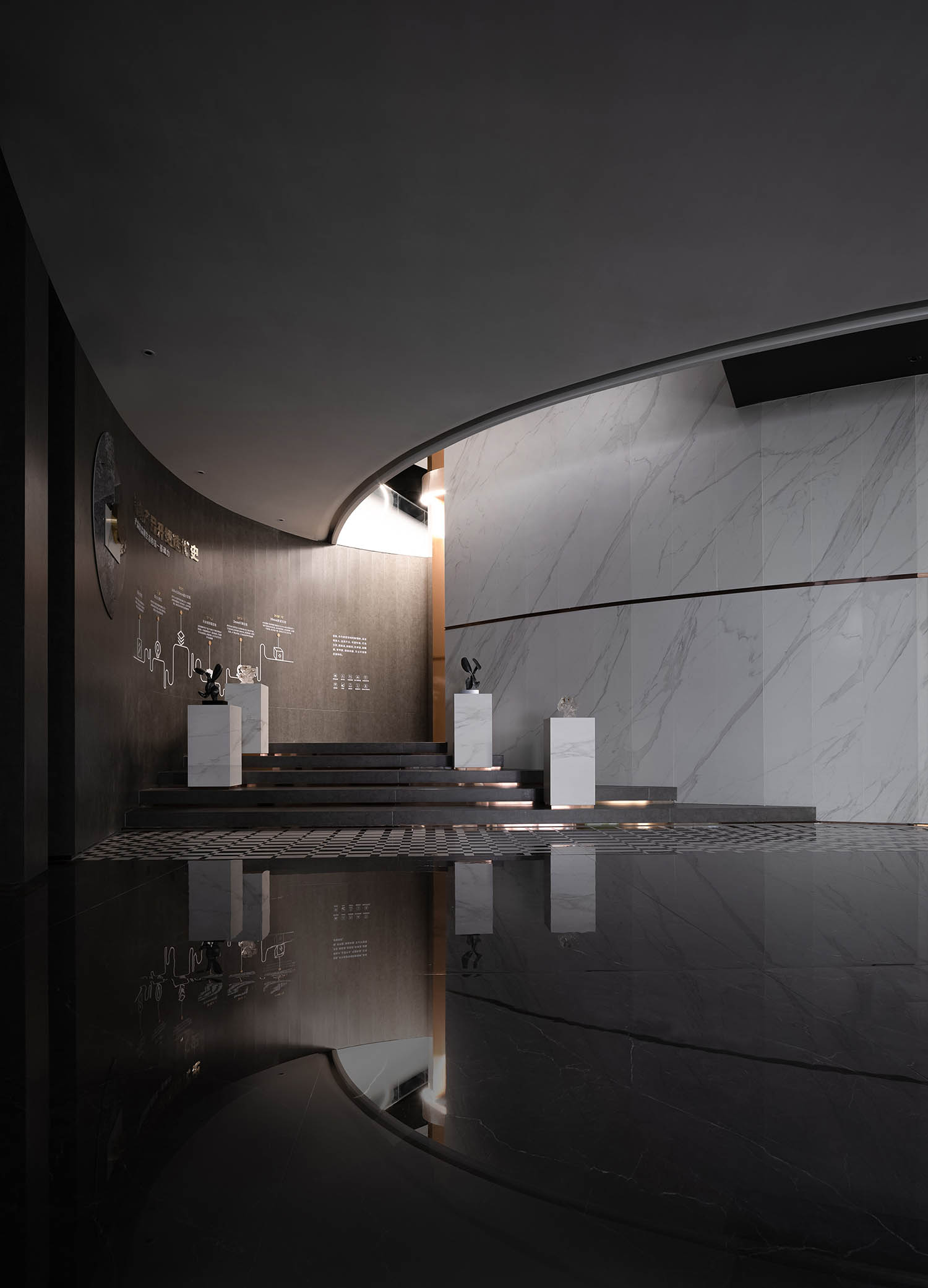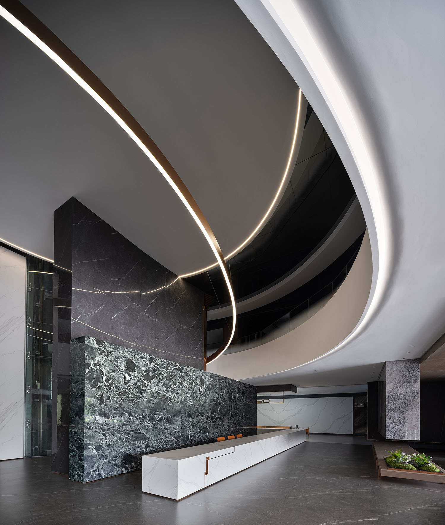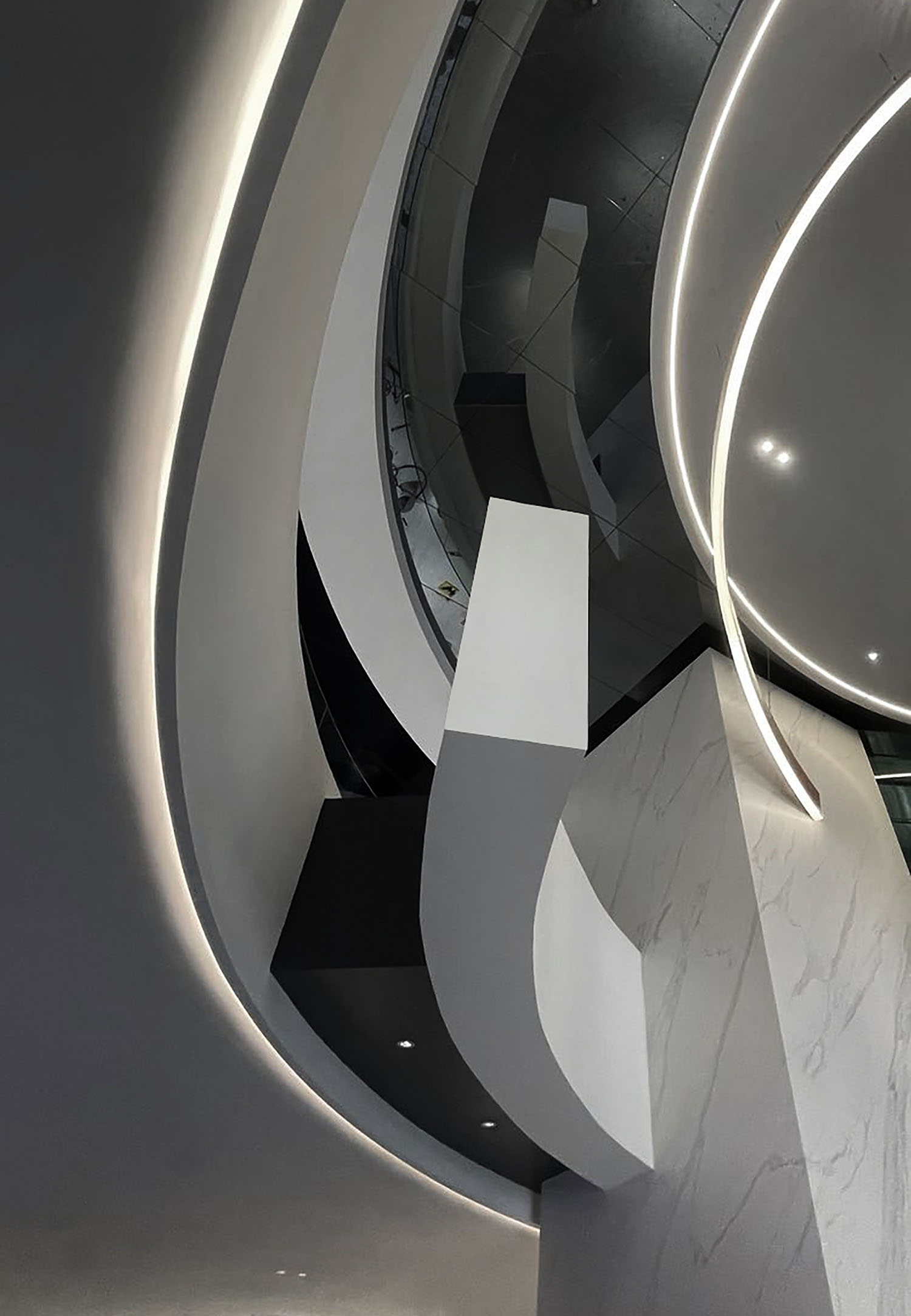 大厅中的圆形、中空结构创造了一种几何美学,蕴含着东方的“圆天方土”哲学,同时也展现了星星的轨迹。在视觉效果和力学原理相结合的基础上,圆形线条设法创造了耐人寻味和意想不到的空间体验。