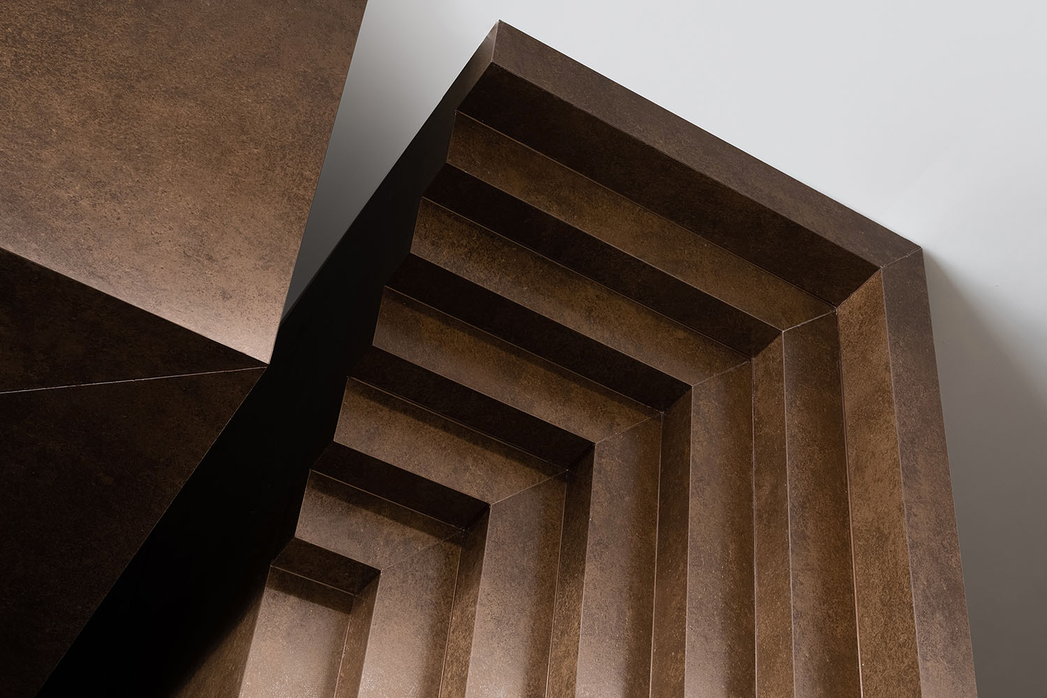 空间的深度感随着光线和阴影的变化而变化。通过对结构的解构和重组,设计师将平面墙壁改造成三维雕塑,表现出几何的、戏剧性的美学和复杂的工艺。