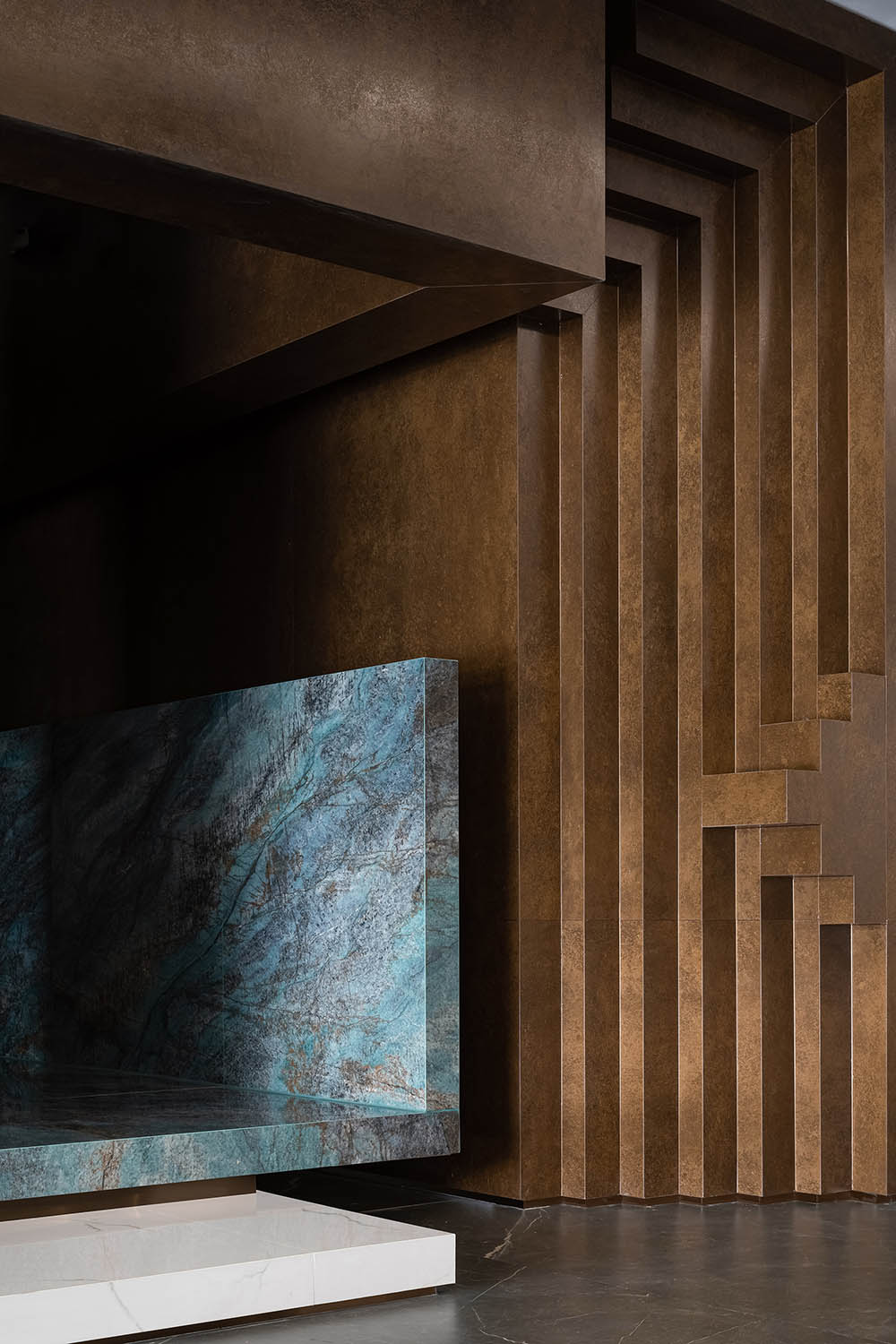原来的楼梯井有一个普通的楼梯结构。设计人员刻意加强和突出楼梯间的空间结构,以体现结构美学。材质上选用赭红色的锈铁质感的岩板搭配绿色亮面奢石,让两种不同色感和质感的材质产生强烈冲撞.