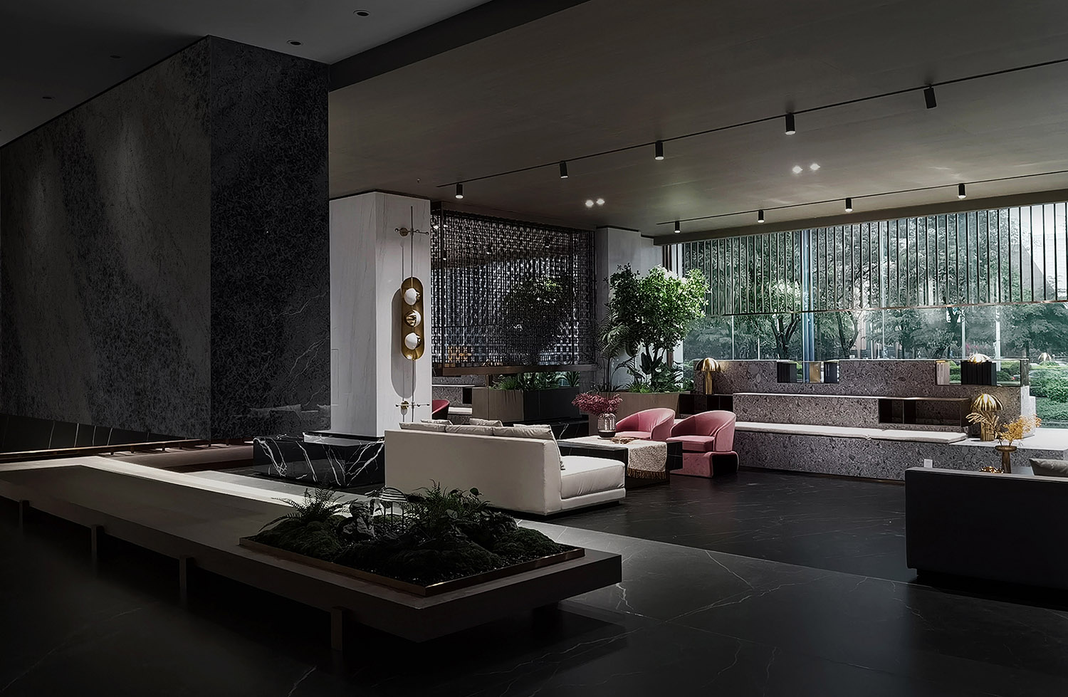 设计师们采用简单、纯正的设计语言来探索人与空间的对话。整个空间环境和谐、低调。柔和优雅的氛围巧妙地展现出来,吸引着游客们进一步探索。此外,柔和的色调延伸到不同的功能区,产生一种安静、柔和的氛围。私人贵宾谈判区由透明的玻璃屏风划定,给人、自然和空间带来了光明和互动