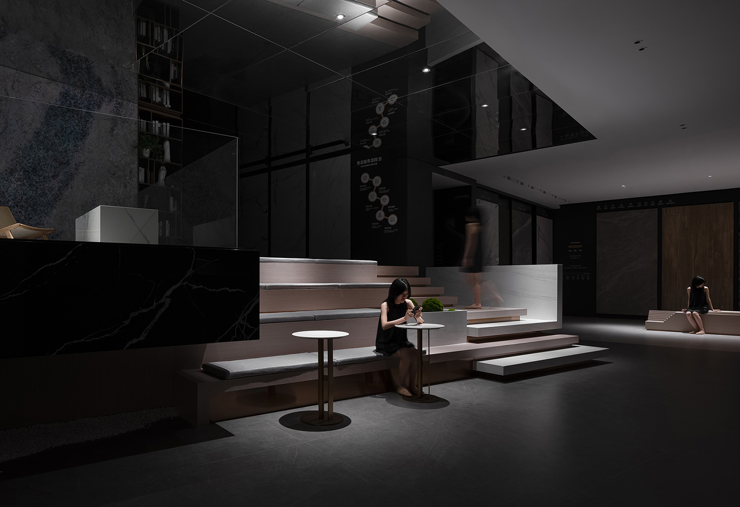 产品展区主要以连纹产品展示为核心。要在这个不对称的空间中取得平衡是很复杂的。空间体与几何块的关系赋予了空间一种独特的艺术形态。接缝、边缘和比例都得到了精确的处理,显示了对细节的追求和对用户的尊重。黄铜是一个低轮廓的空间整合,有助于丰富的空间氛围和视觉效果。木质和石材的采用为空间注入了柔和而细致的表达。
