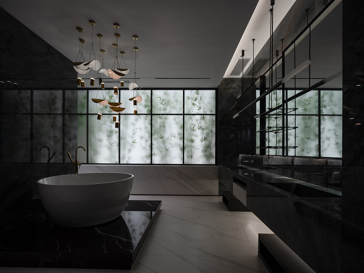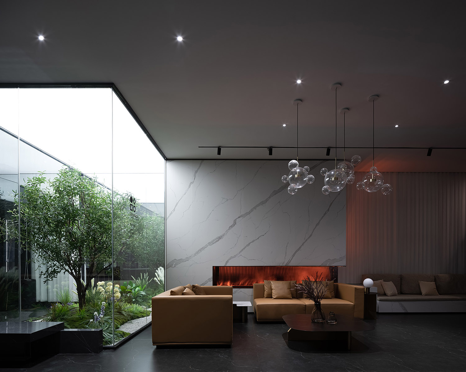 色彩的自然转换将视线引向室外自然景观。变幻的光呈现出一种优雅和永恒的感觉。半开放分区被用来微妙地增强空间场景,并传达一种更加开放、自由和温和的氛围。随着位置和视线的变化,人们可以欣赏到各种各样的场景。