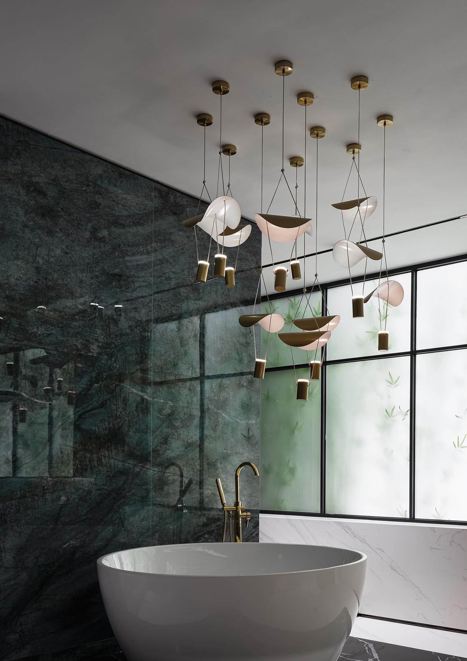 打磨精良的黄铜圆环吊灯斜形穿插于空间之中,显示后工业时代精工的质感。它更像是一个艺术装置,它打破了设计的界限和界限。它既是独立的,又与空间连接。此外,它激活了空间节奏,同时也表明了空间的主题和艺术性。