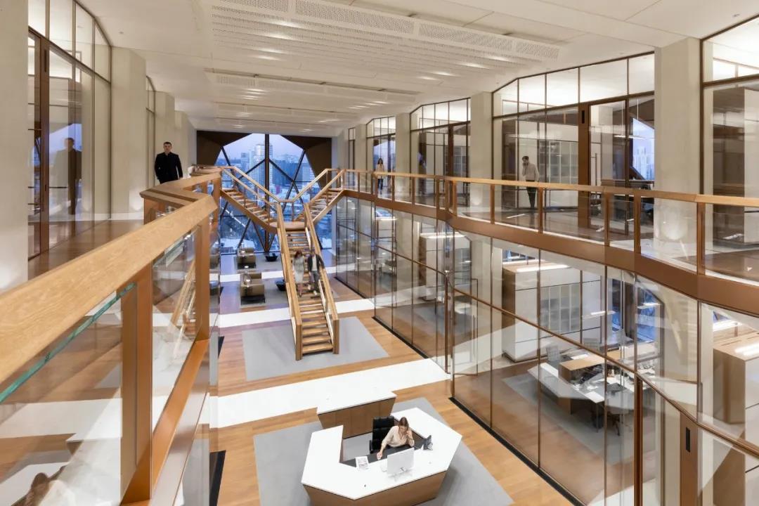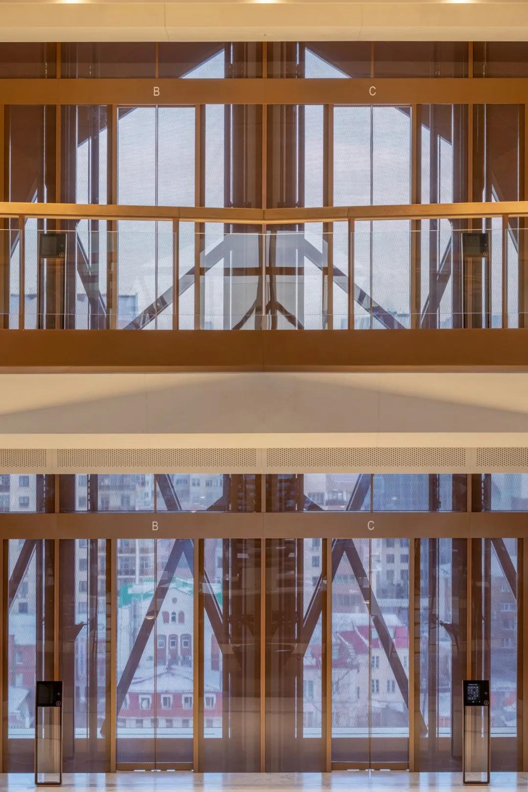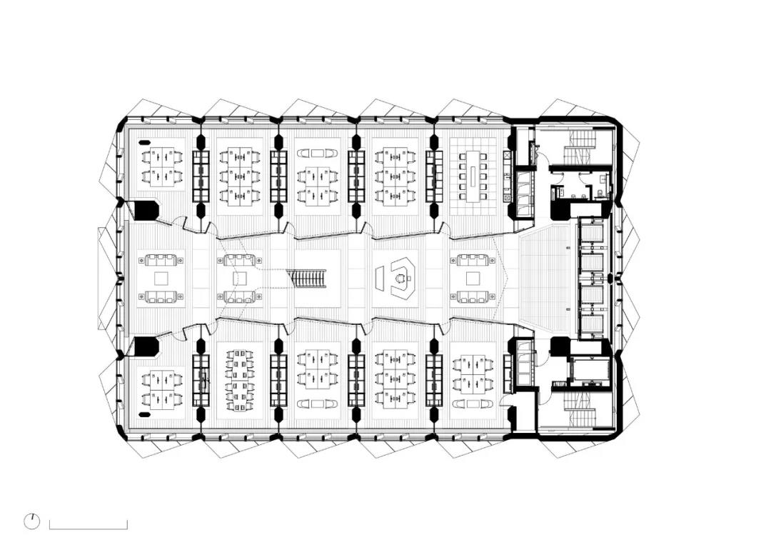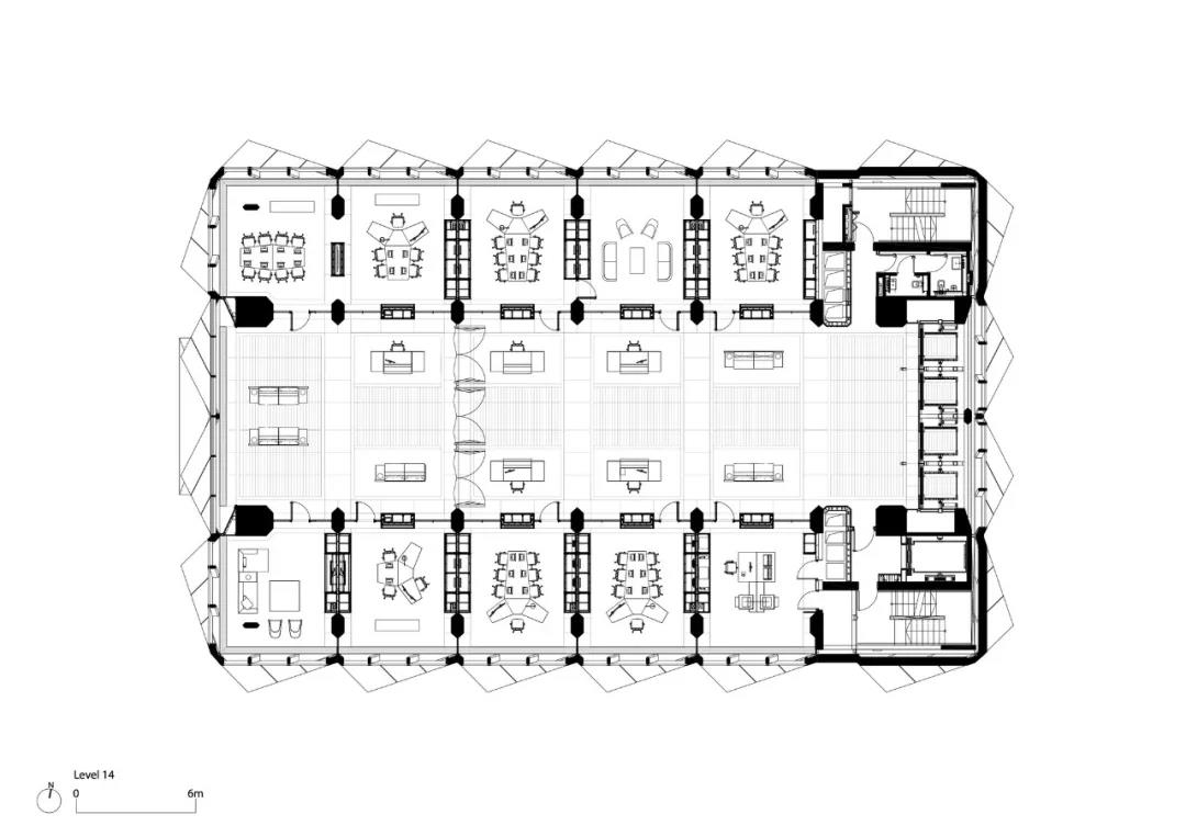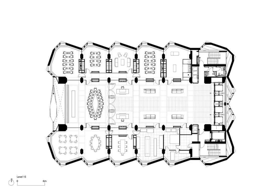 每个两层的模块包括一对办公室,一个堆叠在另一个之上——这通过双层包层模块在外部表现出来。模块排列在中央走廊的两侧,作为一个分组空间,设有休息厅,通过玻璃电梯竖井可以看到城市的景色。在第15层,顶部照明的空间为公司范围内的聚会和活动创造了一个灵活的空间。