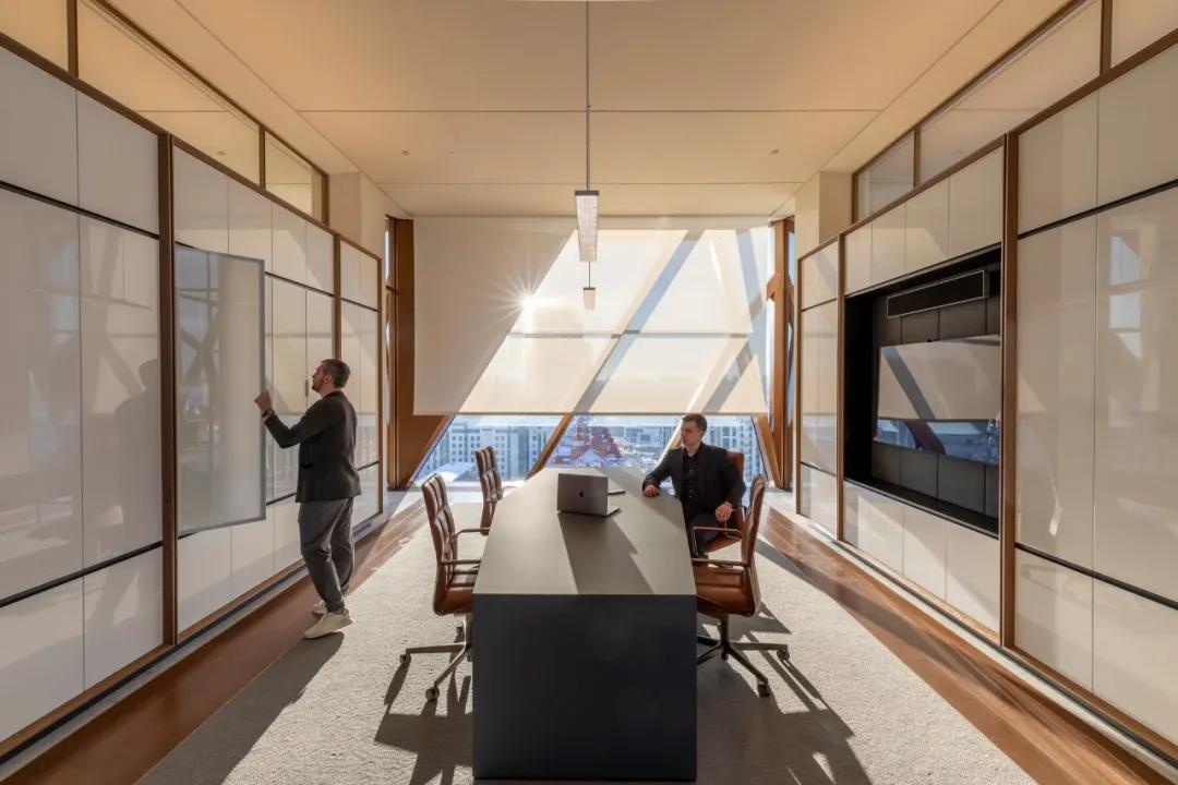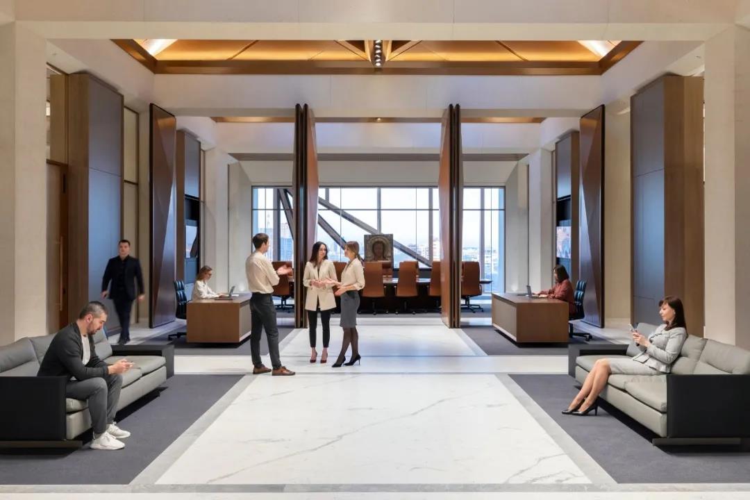 办公楼层的出发点是将总部改造为“员工的房子”——而不是传统的大型公共工作空间,房间是更亲密的、家庭规模的。该事务所的工作场所咨询小组分析了客户的运营情况,并帮助设计了这些房间的创新模块化系统。这是与内部工程团队共同开发的,以实现快速施工,并确保理想水平的自然光用于集中工作。