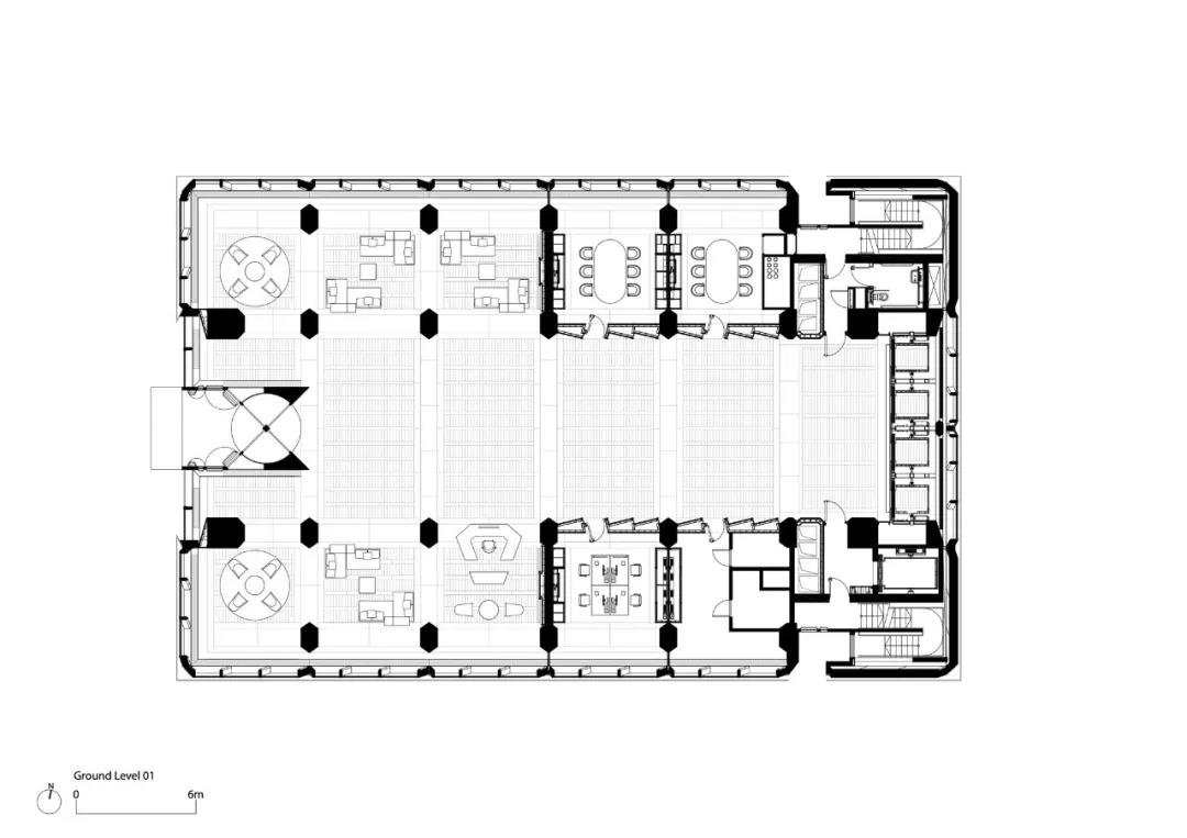 这里可以俯瞰城市和最近经过景观美化的河岸。将绿色植物延伸到建筑的底部,为员工创造了一个私人花园。景观与蜂窝的内部安排相呼应,一系列的“外部房间”为员工提供了放松和吃午餐的安静空间。大楼内的其他设施包括视频会议室和董事会会议室、会议空间和行政用餐区。
