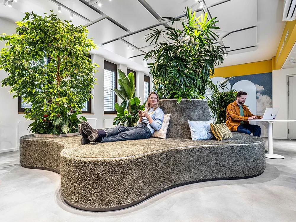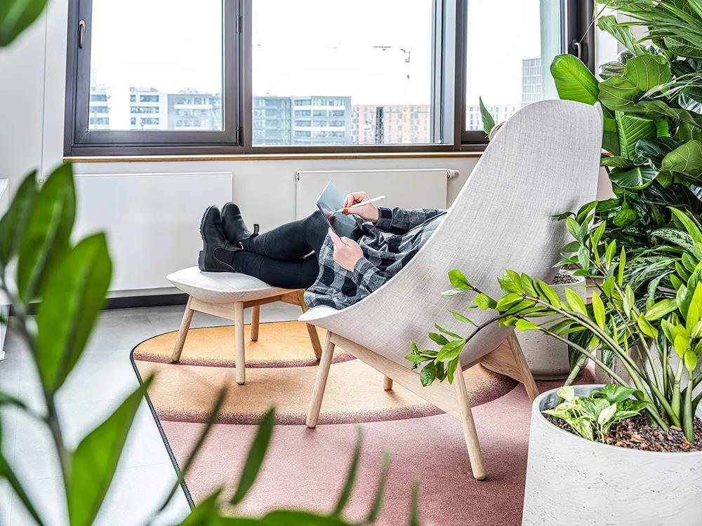 员工可以在任何时候为特定的工作选择一个适合自己的临时工作点——或独自躲在帘幕背后、或坐在黑暗的角落或明媚的阳光下,或者就是站在升降桌前面。