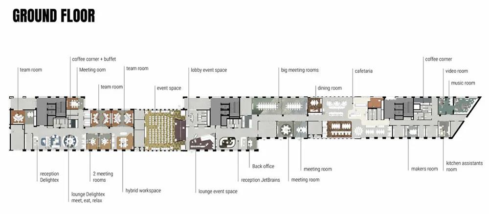 JetBrains慕尼黑办公室总面积约12,000平方米,将容纳360名员工。除了常规功能,这处办公室还包括三个屋顶露台、一个自助餐厅、一处健身房、一间按摩室、一处内部大型活动空间、一间音乐室、一间创客室和一处游戏空间。