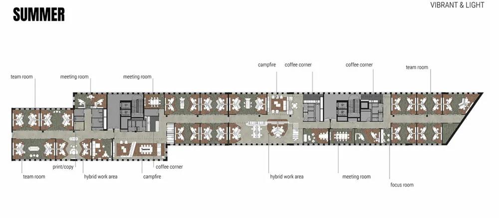 D/DOCK的首席设计师艾琳·斯内尔(Irene Snel)将办公室所在的这座建筑视为一座城市:“所有楼层看起来都不尽相同,各自有着不同的情感调性,所以每个人都应该能找到一个让自己感觉最好的地方”。