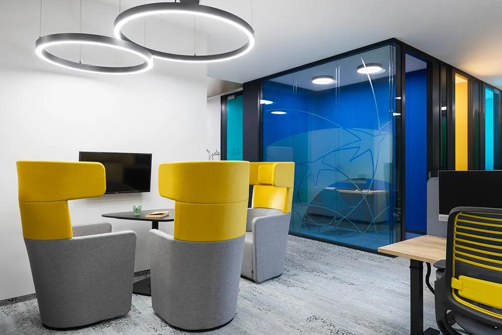 此外,这里还配置了七个隔音电话亭,分别饰以不同的靓丽色彩,赋予每个电话亭独特的个性特色。而每一间会议室的设计也都与法国巴黎银行有着直接的文化关联,每一间都有其专属的装饰元素展现其独特的文化精神。