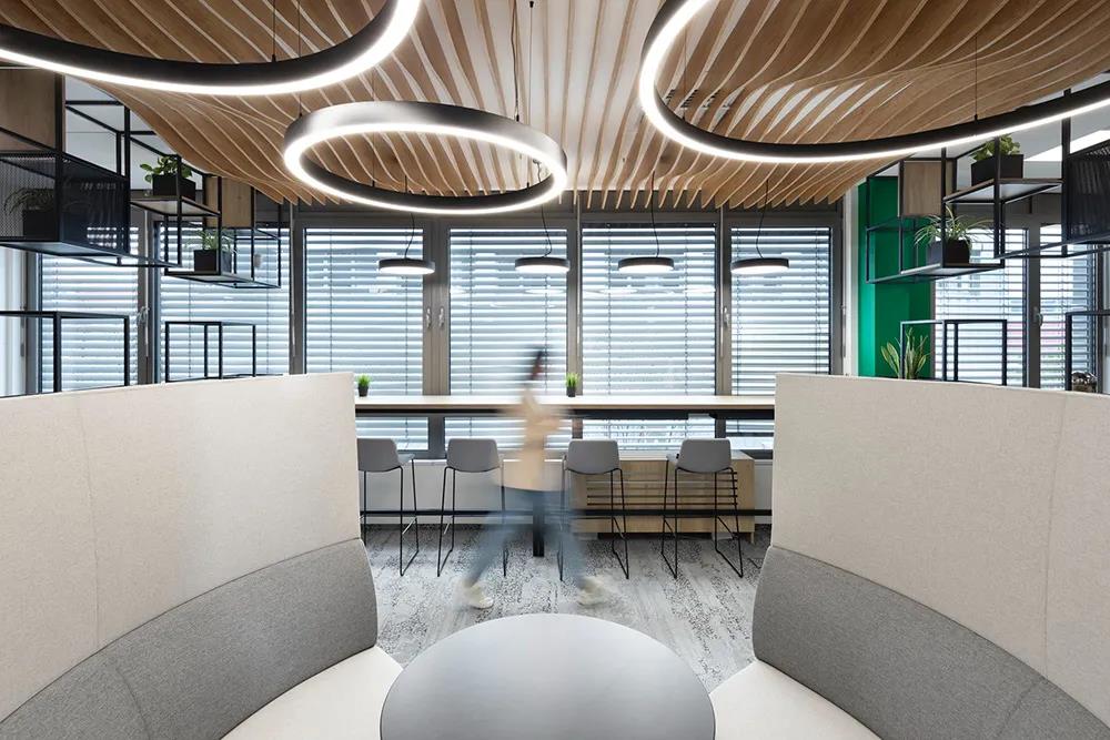 大型公共餐厅和休息区配有可随时演讲或汇报的先进设备。休闲咖吧形式的非正式会议室也是灵动办公形式中最受大家喜爱的场景。