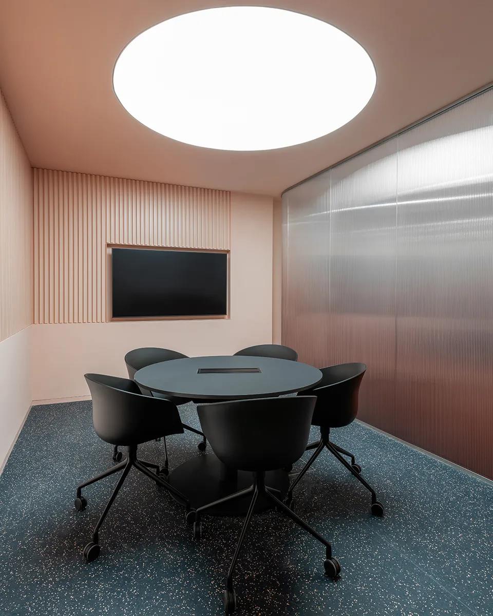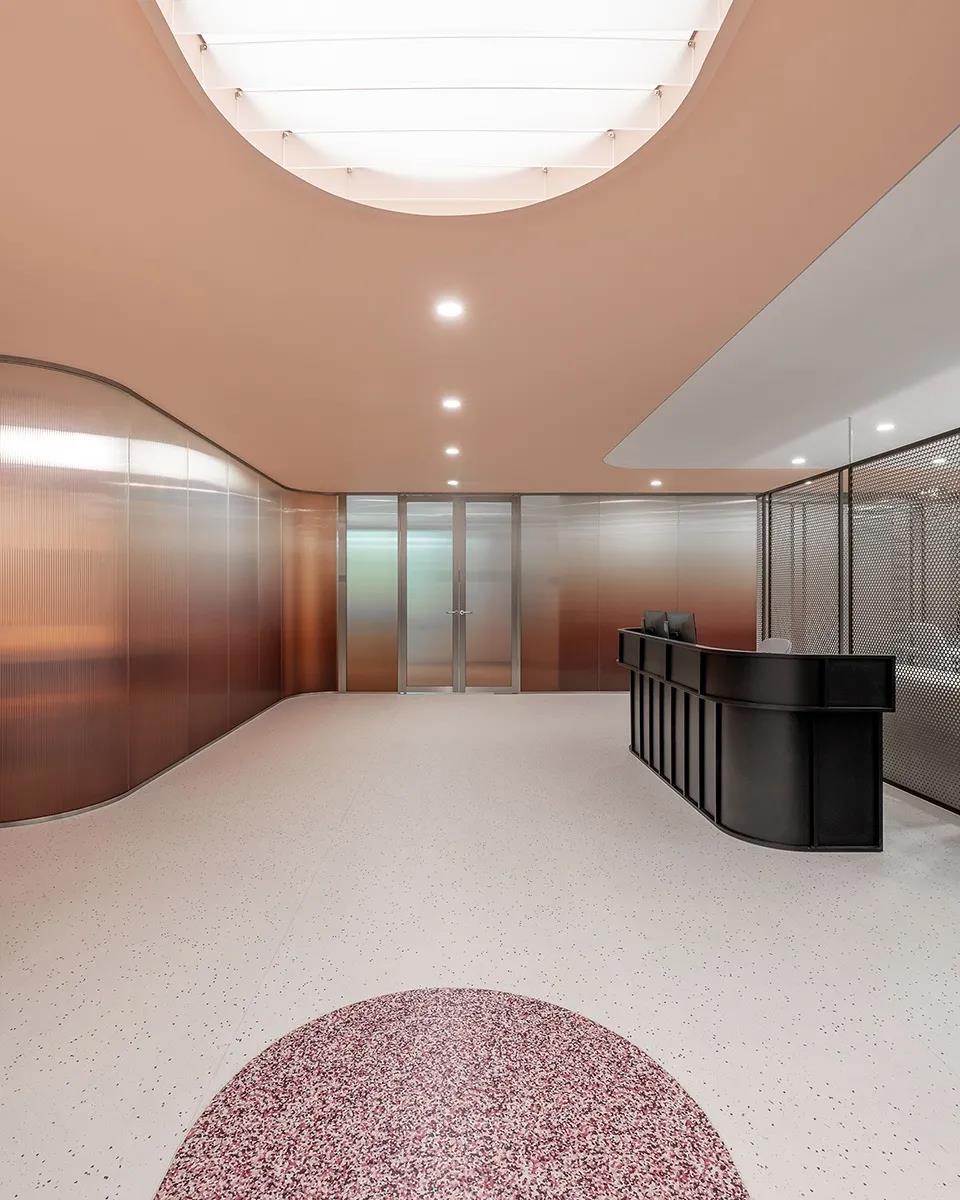 进门处和前台旁的三间会客室,使用渐变色长虹玻璃,颜色由粉色向透明过渡,会议室内墙壁呈淡粉,嵌有不对称装饰面板,天花采用椭圆形透光膜照明。