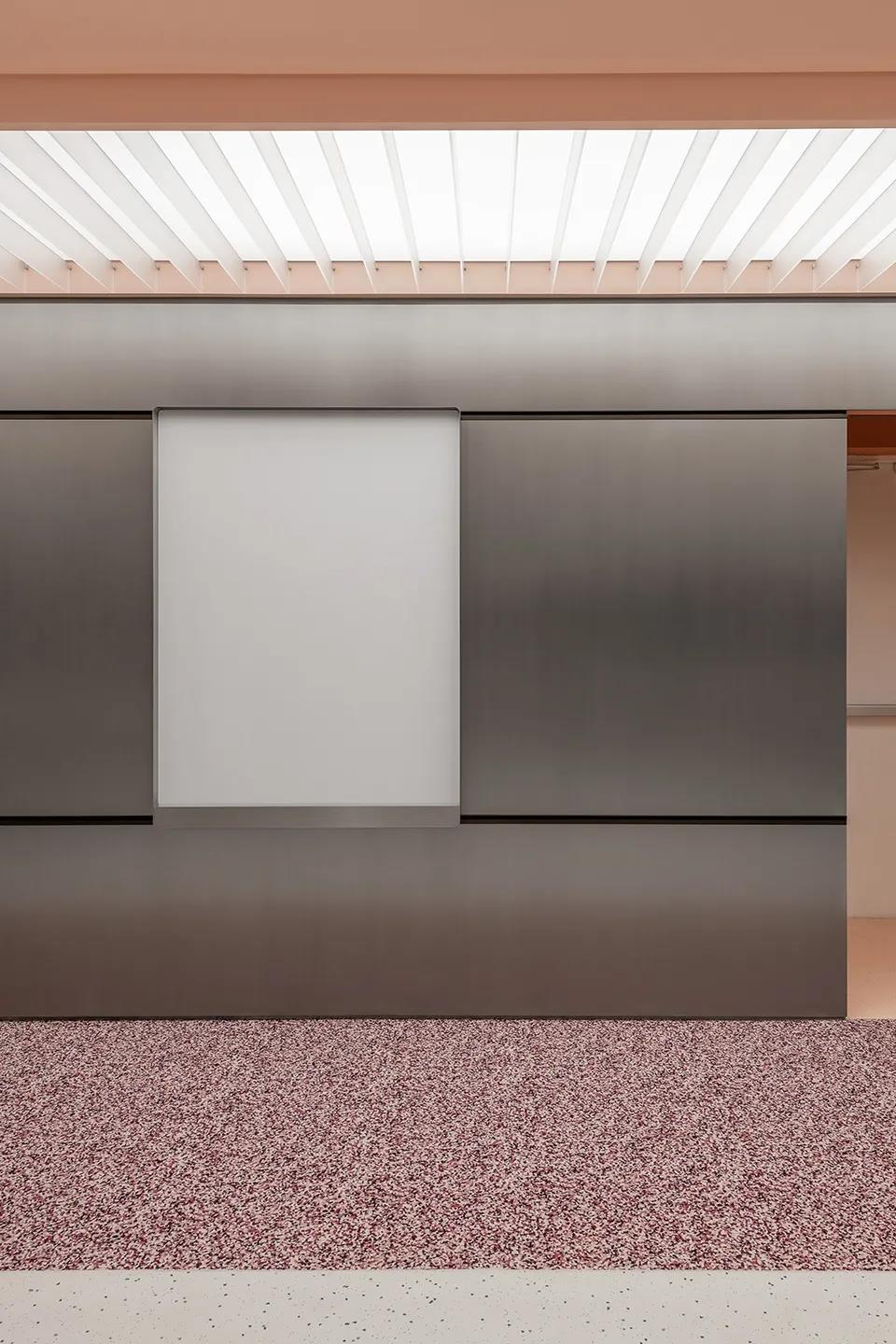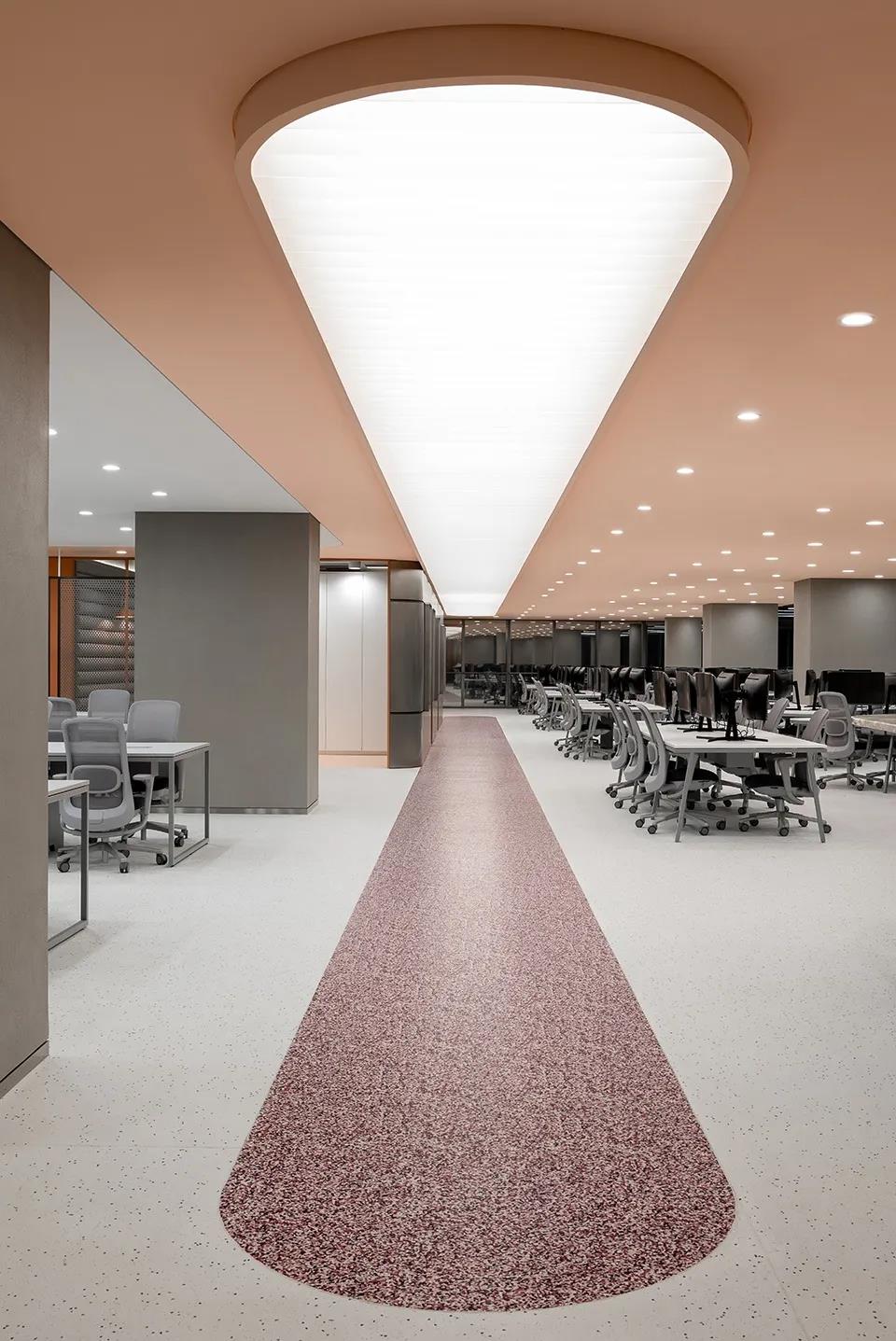 天花为长条形张拉膜光幕,外饰一层玻璃格栅,与之相对的是深红色的椭圆形乙烯基地面装饰。拉丝不锈钢墙板外部嵌有滑动式白板和留言板,便于办公过程中的协同合作。