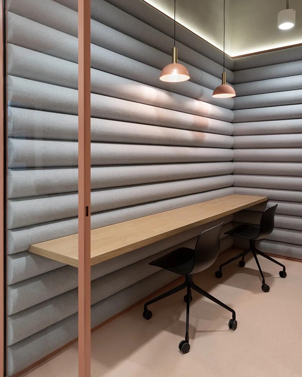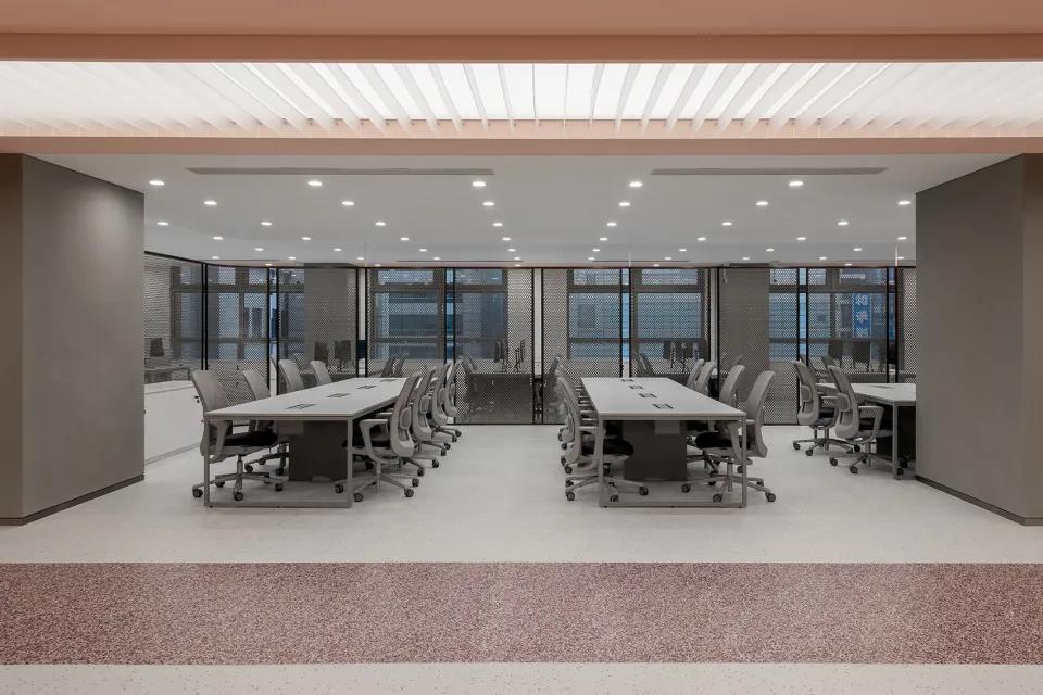 空间四周排布着会议室、打印室、茶水间和一些安静角落,由珊瑚色金属屏风做围合,其天花也延续了屏风元素,和暴露的混凝土天花形成对比。