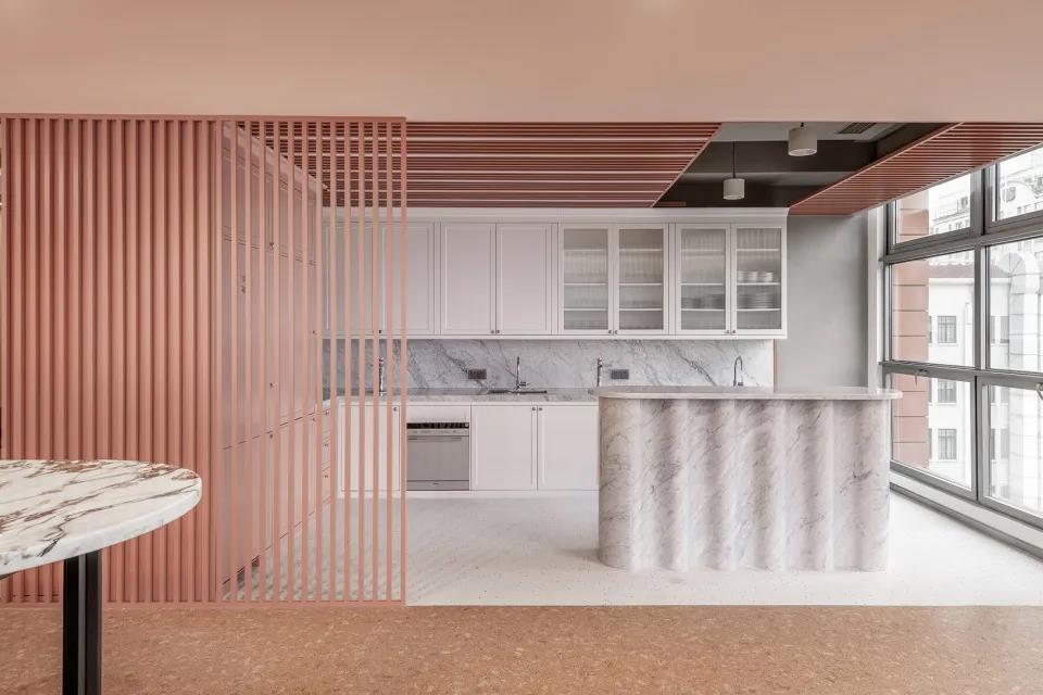 茶水间内有一个由卡拉白大理石打造的波浪形岛台,休息室的地板为软木,一张纹理感强烈的定制大理石长桌,让这里看起来休闲感十足。
