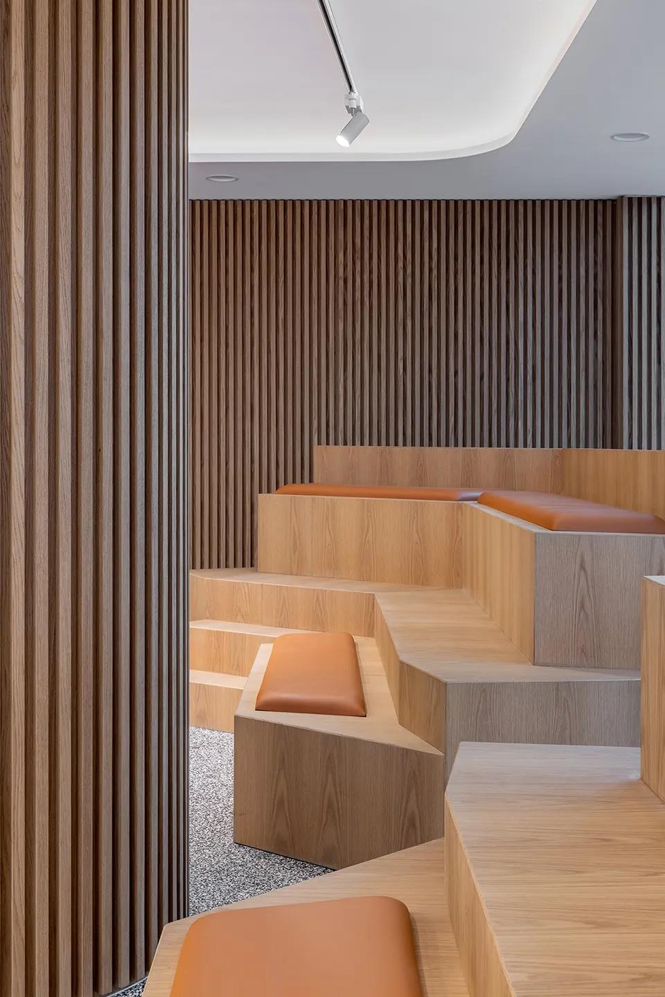 艺术感丰富的木条和波浪形布面墙板,对应前面的屏风,大面积统一运用,除了色彩,在结构的选择上,也高度统一。